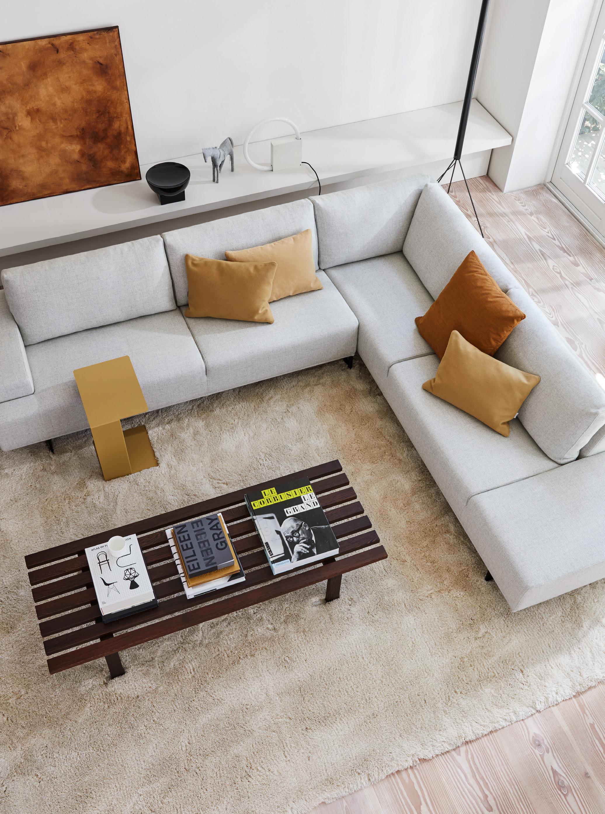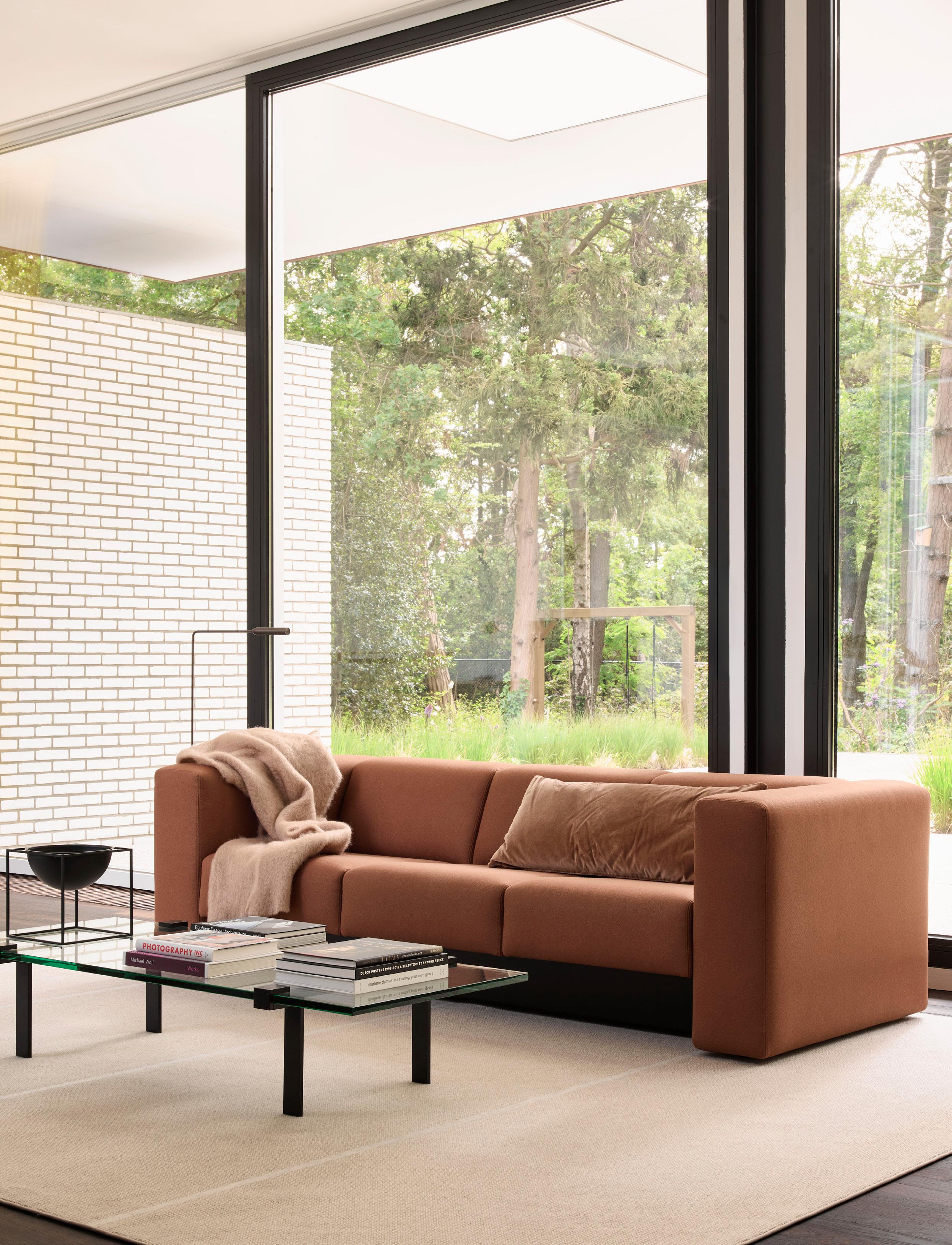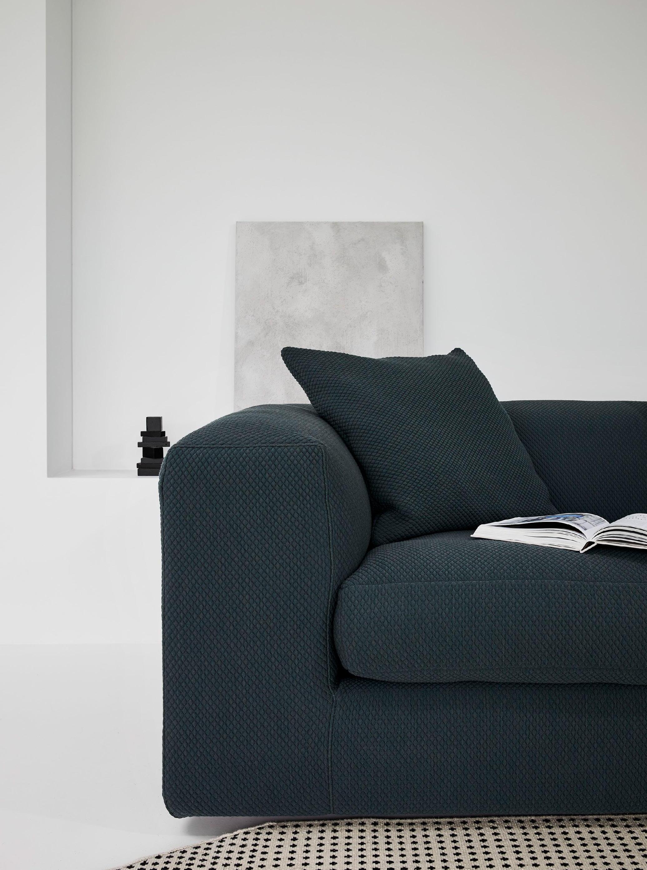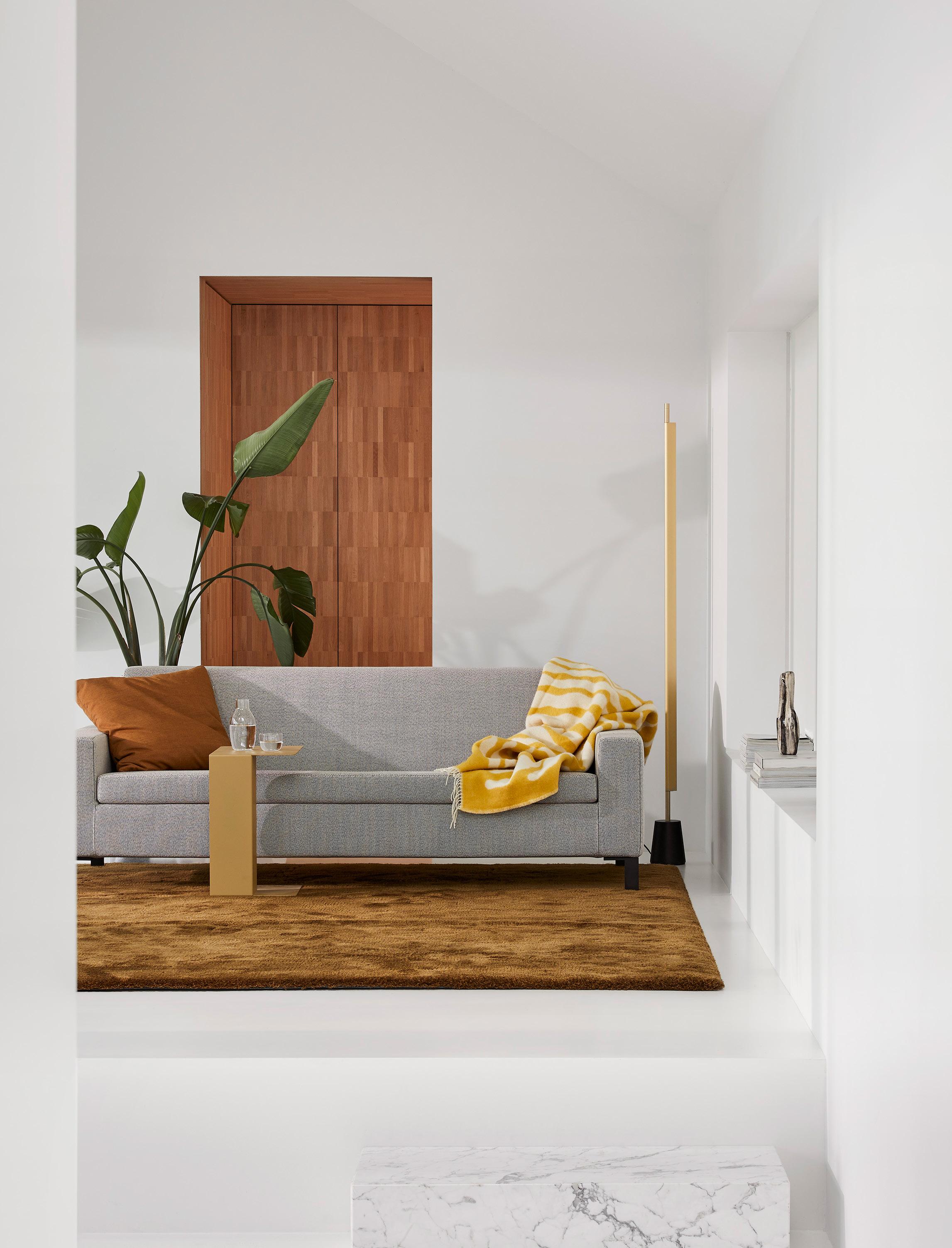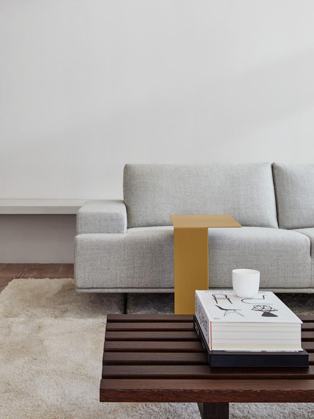 The 10010 Prime was designed by Studio Truly Truly in 2020. The sofa is comfortable, and its thick, almost voluptuous seat makes it look soft yet architectural. The arm cushions hang just slightly over the edge of the slender base, giving the design character.