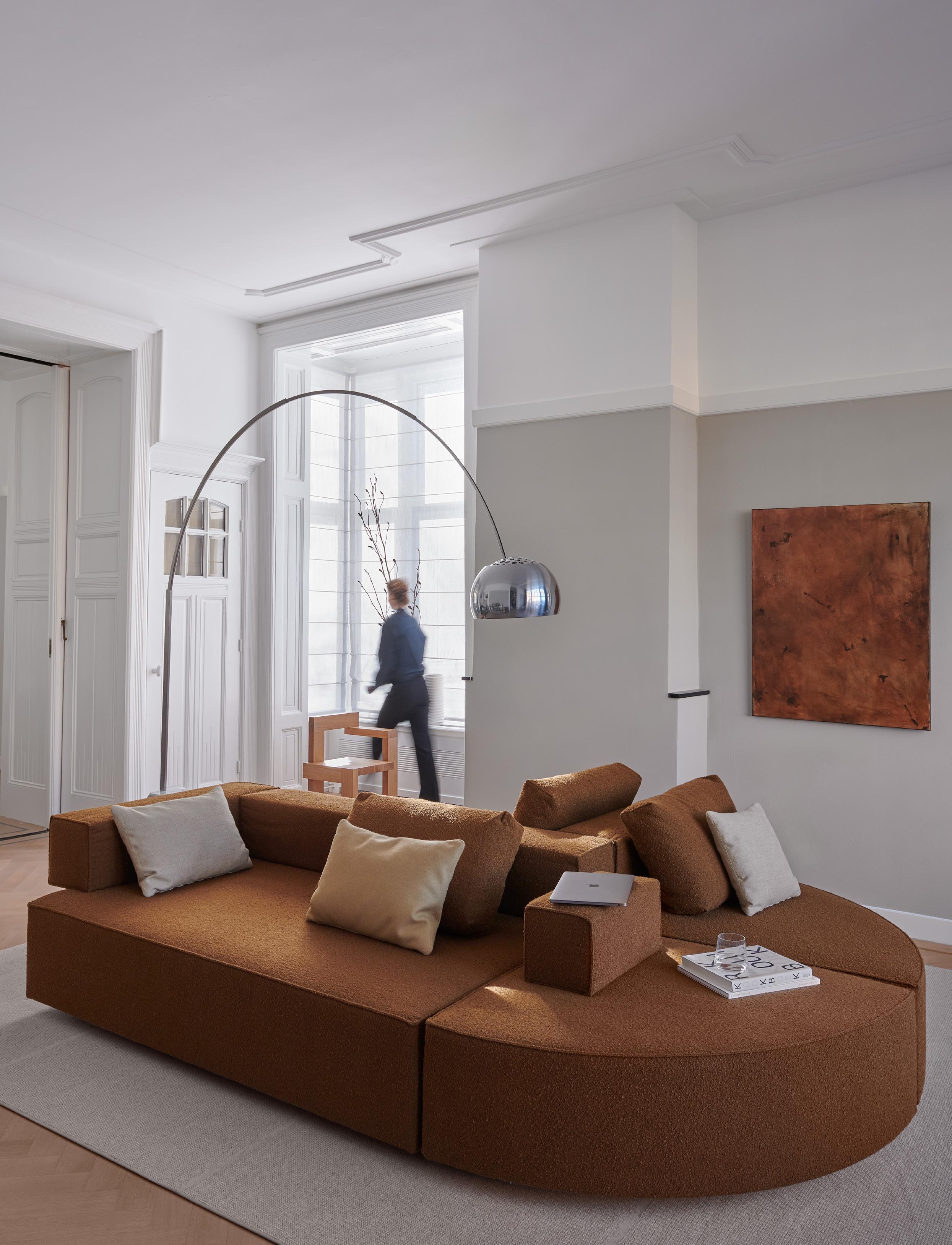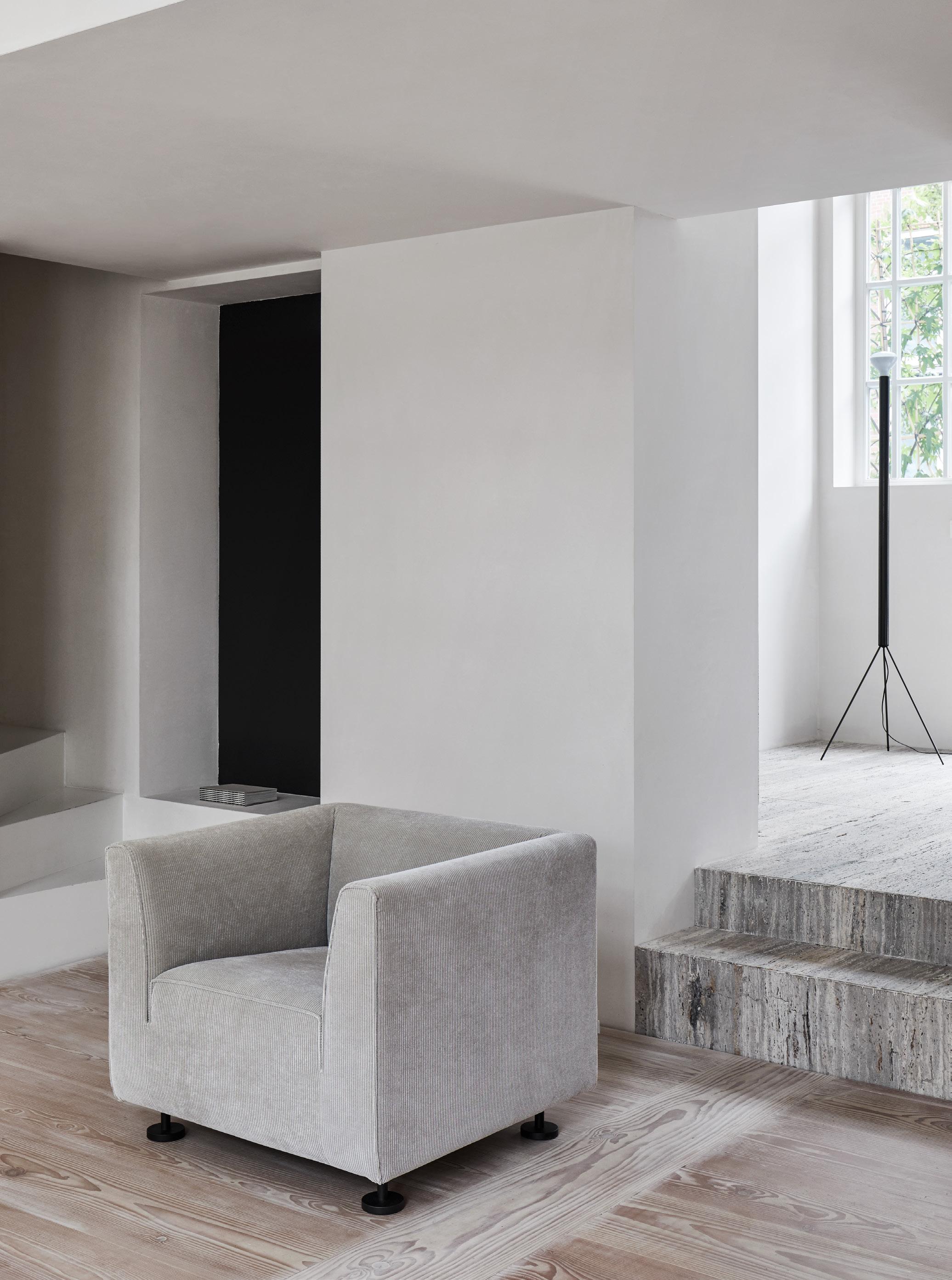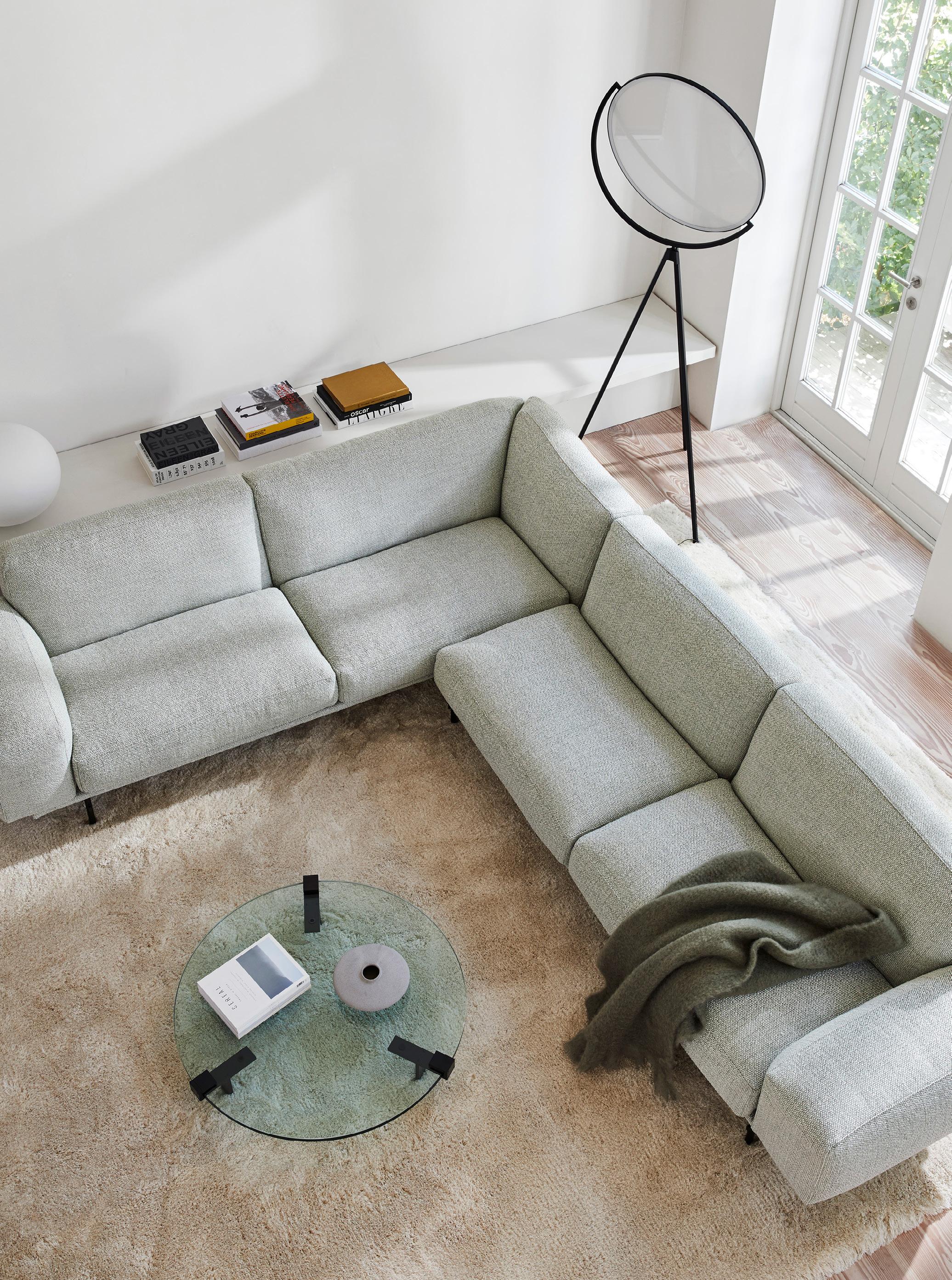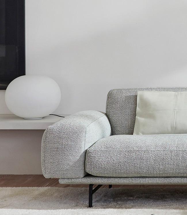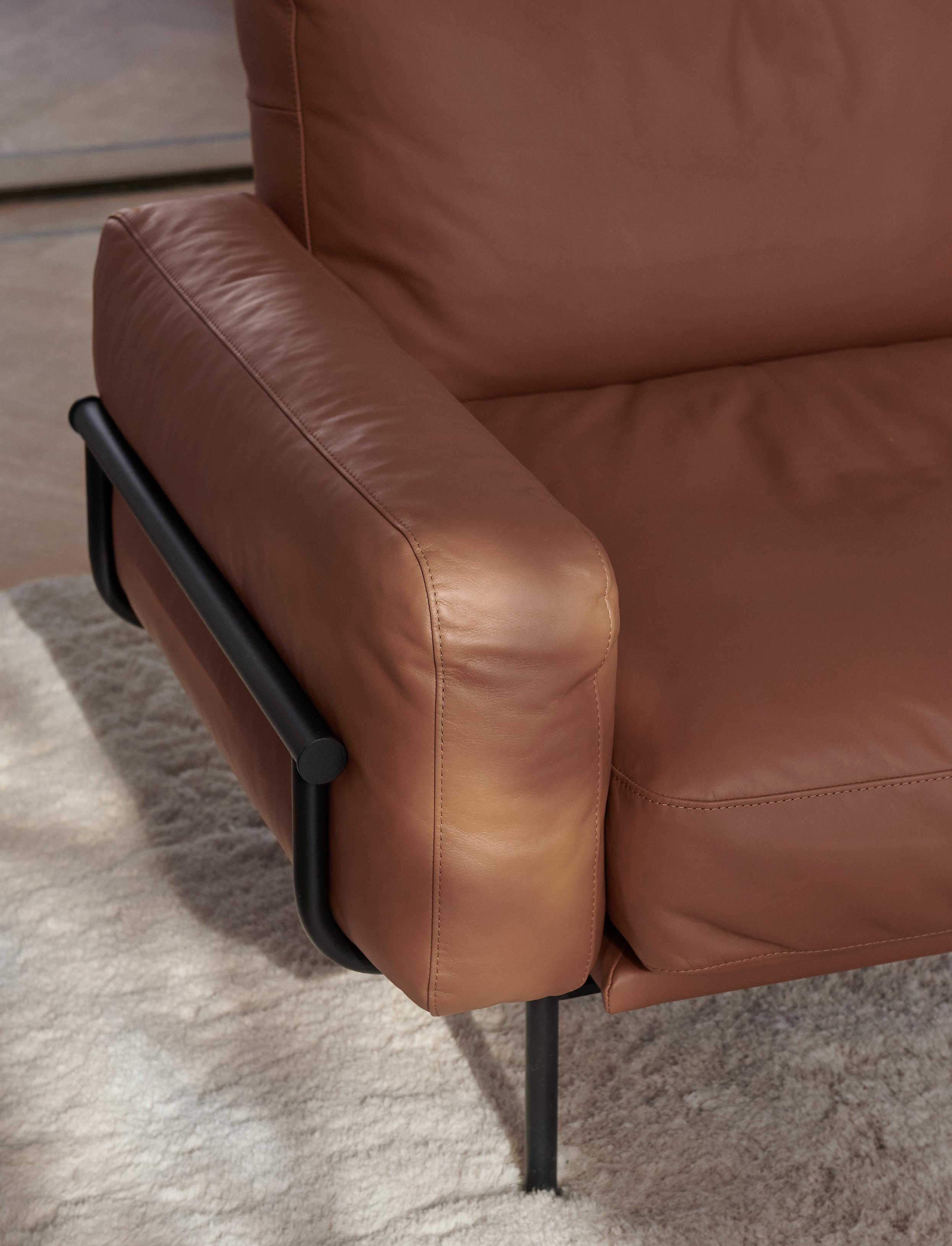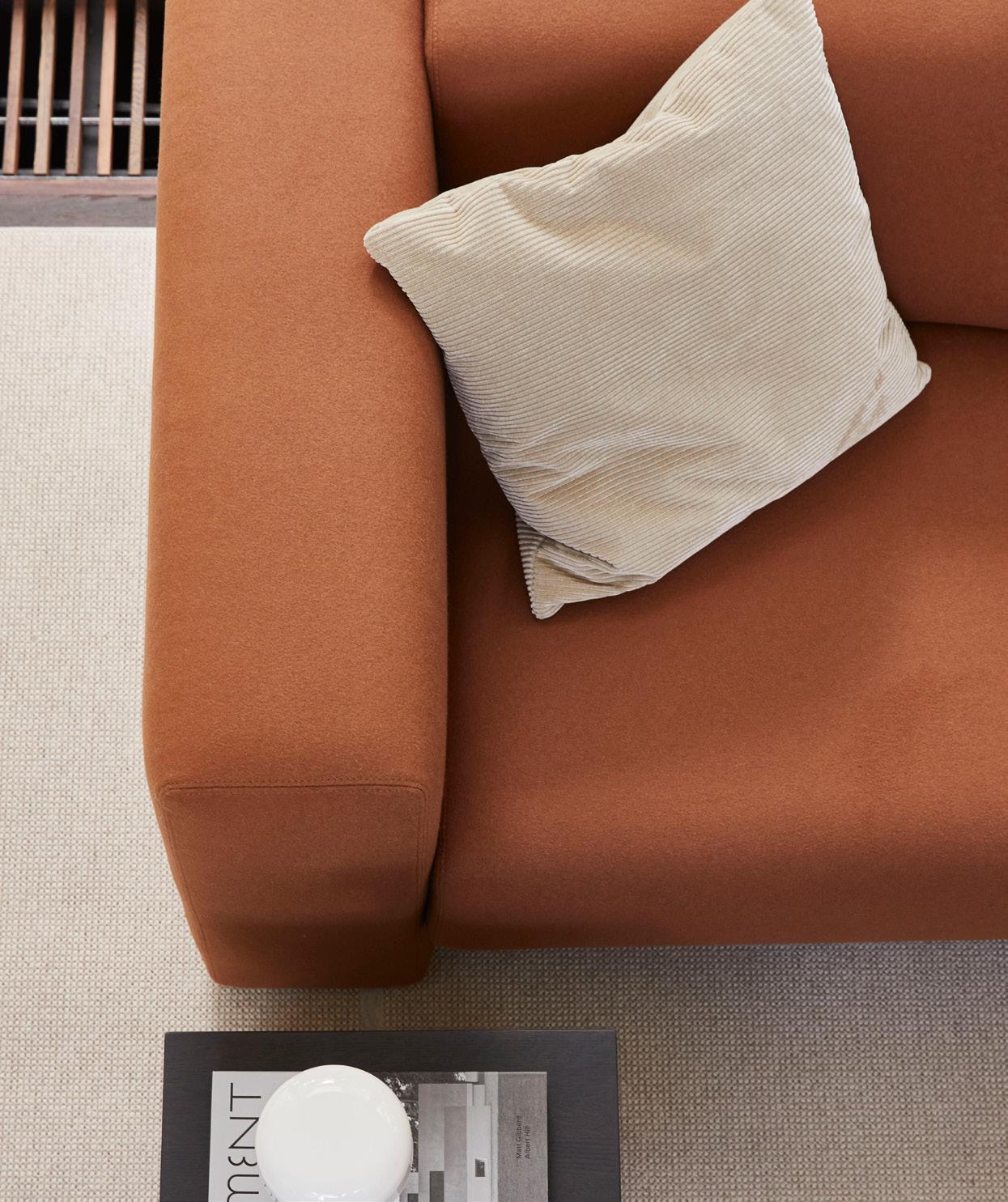 The 10010 Prime was designed by Studio Truly Truly in 2020. The sofa is comfortable, and its thick, almost voluptuous seat makes it look soft yet architectural. The arm cushions hang just slightly over the edge of the slender base, giving the design character.