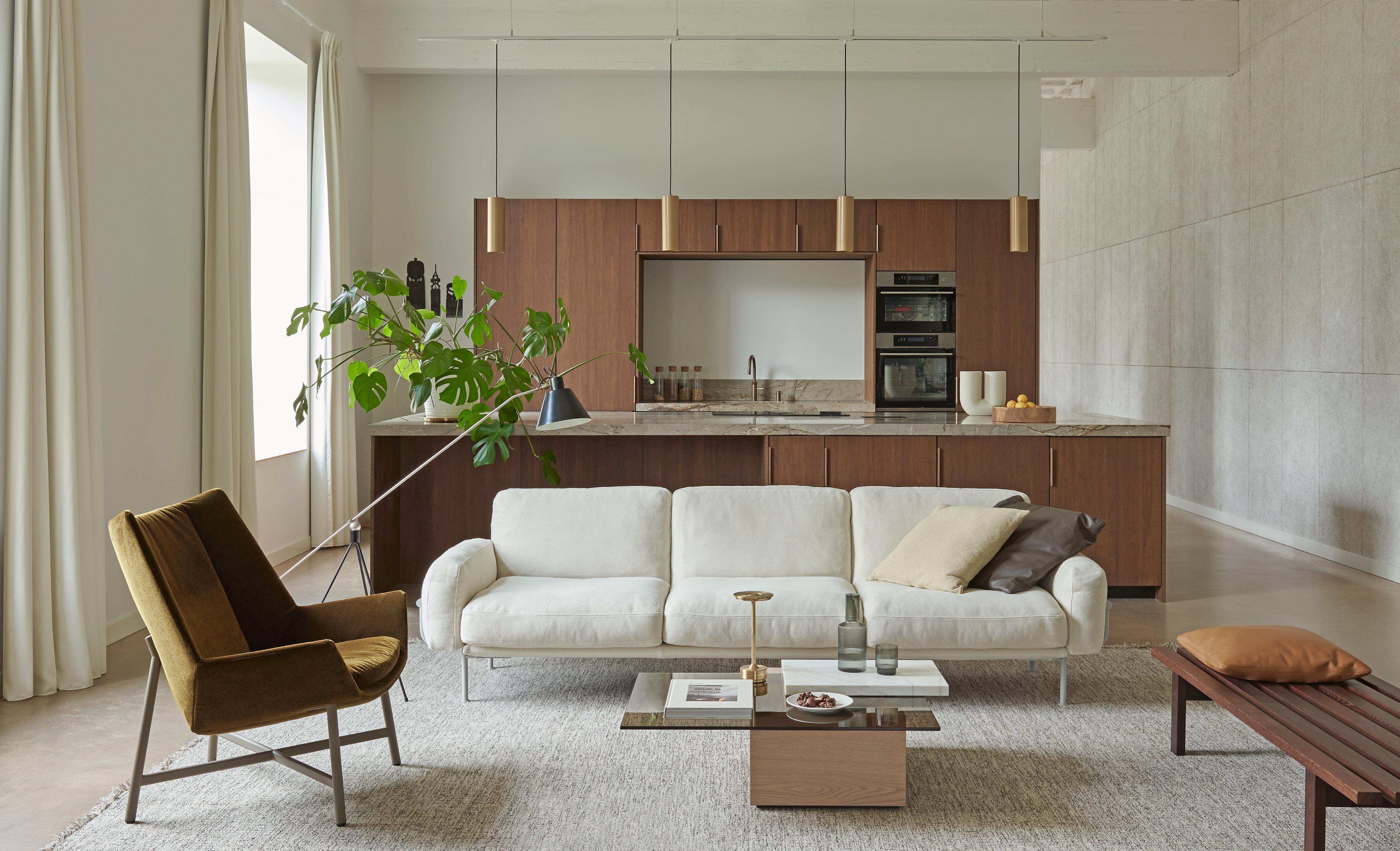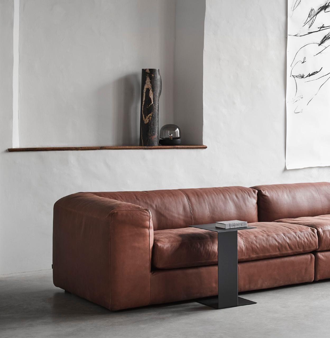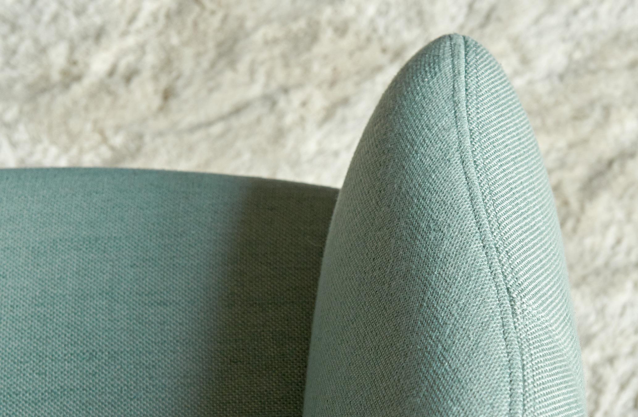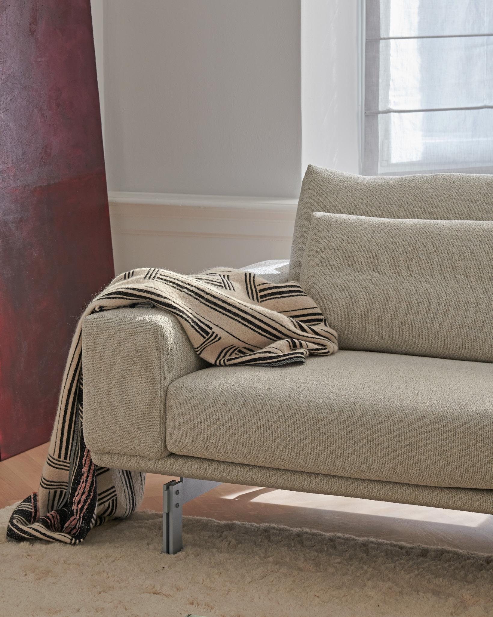 The 10010 Prime was designed by Studio Truly Truly in 2020. The sofa is comfortable, and its thick, almost voluptuous seat makes it look soft yet architectural. The arm cushions hang just slightly over the edge of the slender base, giving the design character.