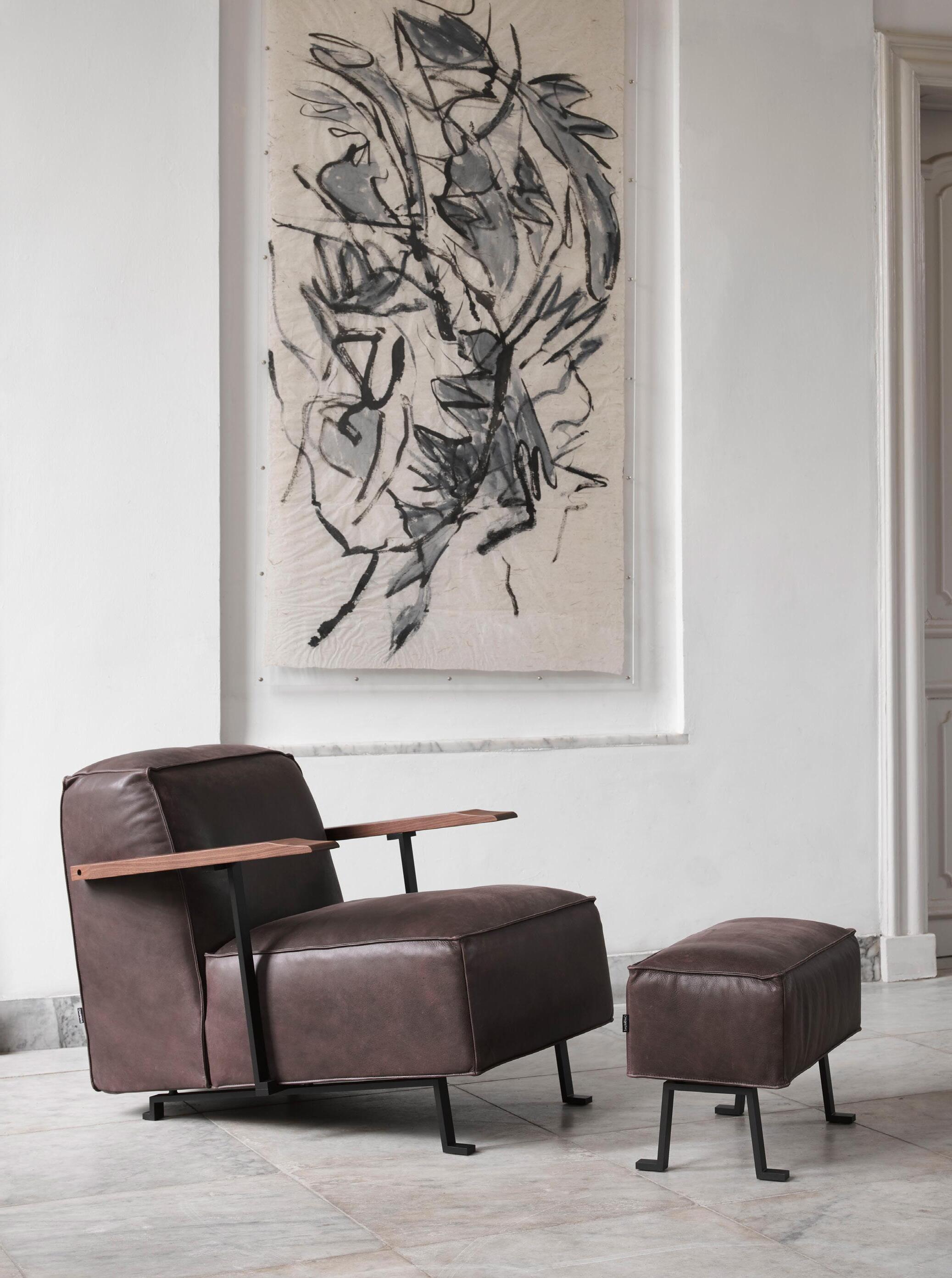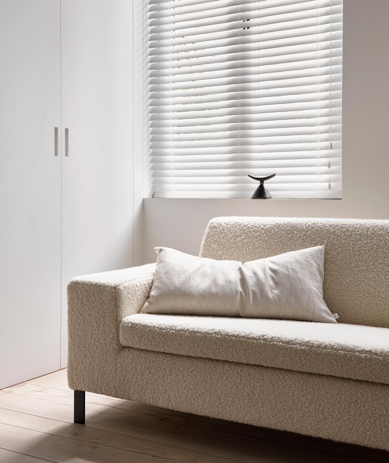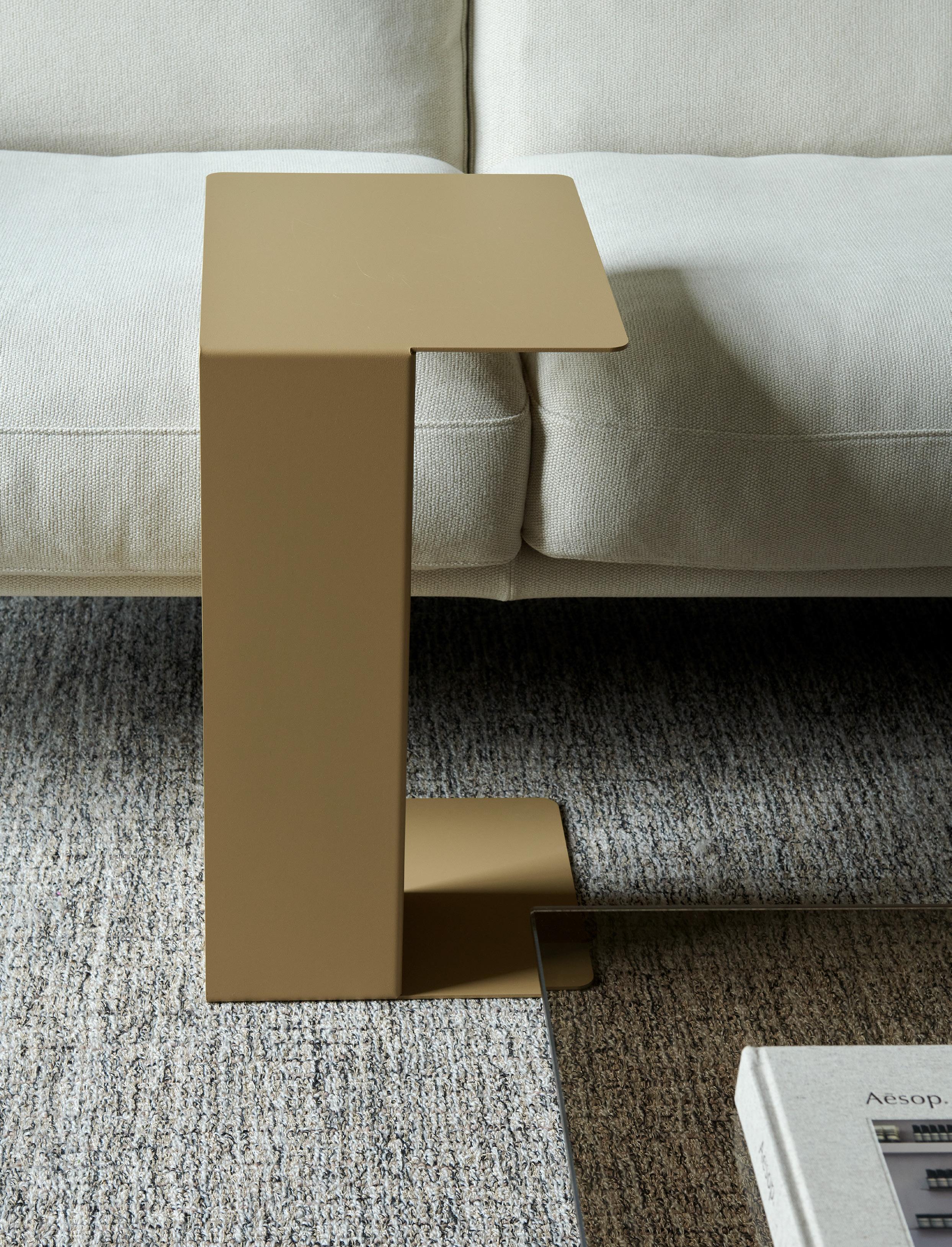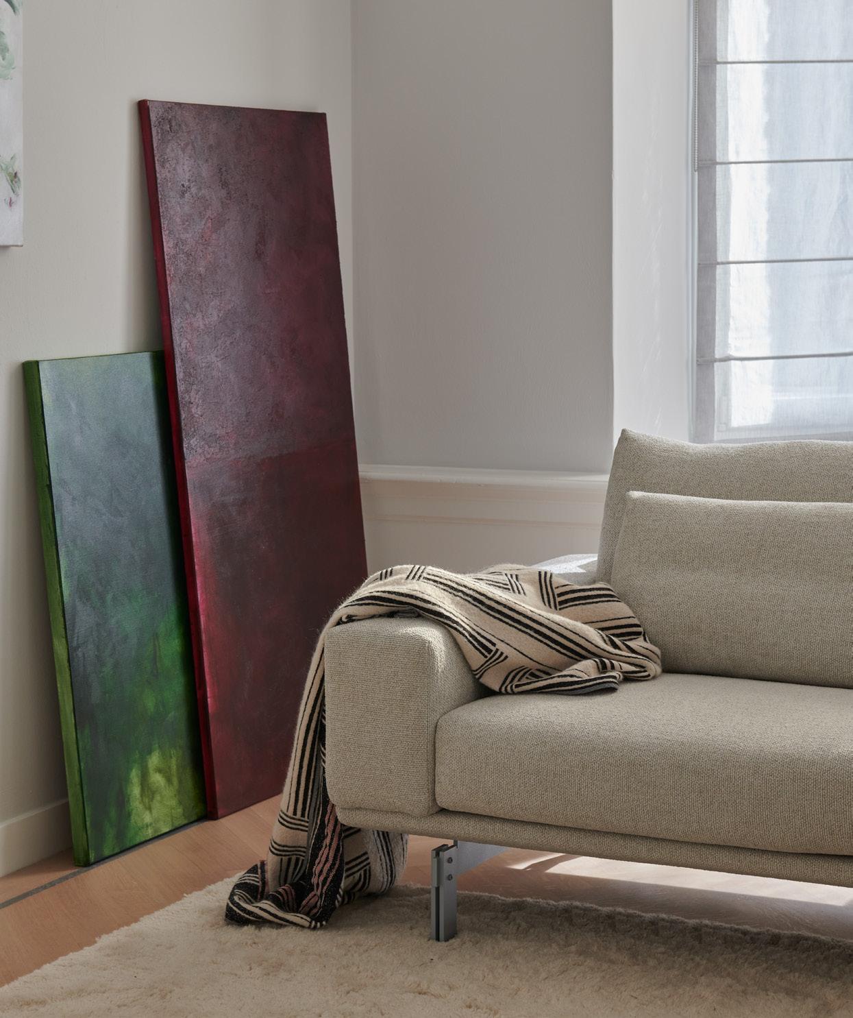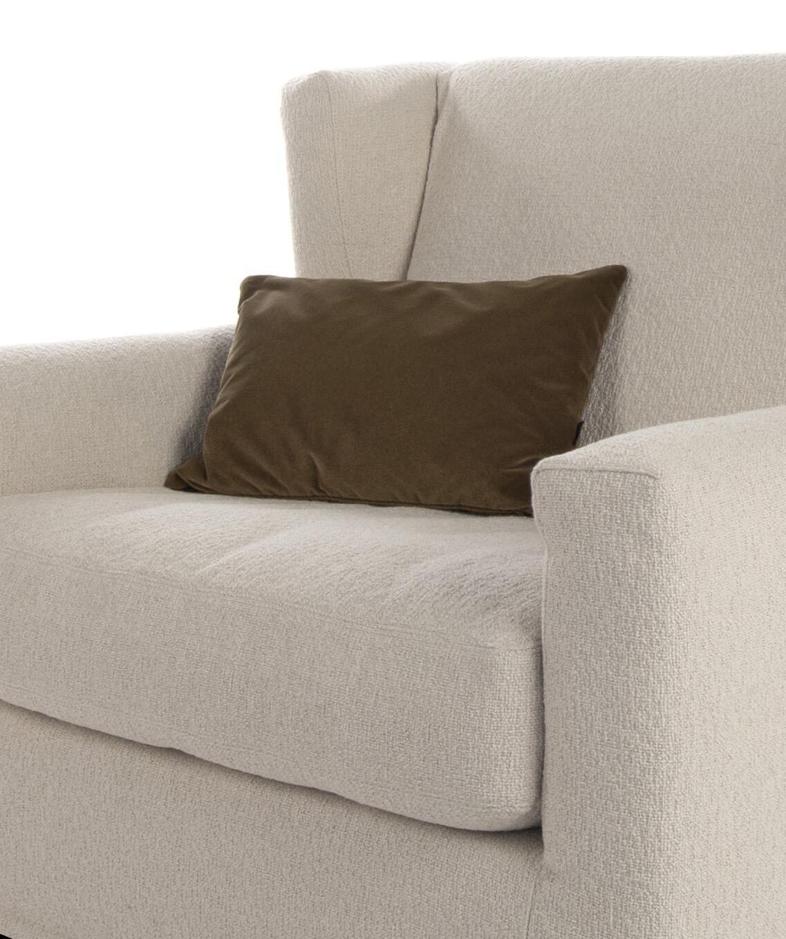 The 10010 Prime was designed by Studio Truly Truly in 2020. The sofa is comfortable, and its thick, almost voluptuous seat makes it look soft yet architectural. The arm cushions hang just slightly over the edge of the slender base, giving the design character.