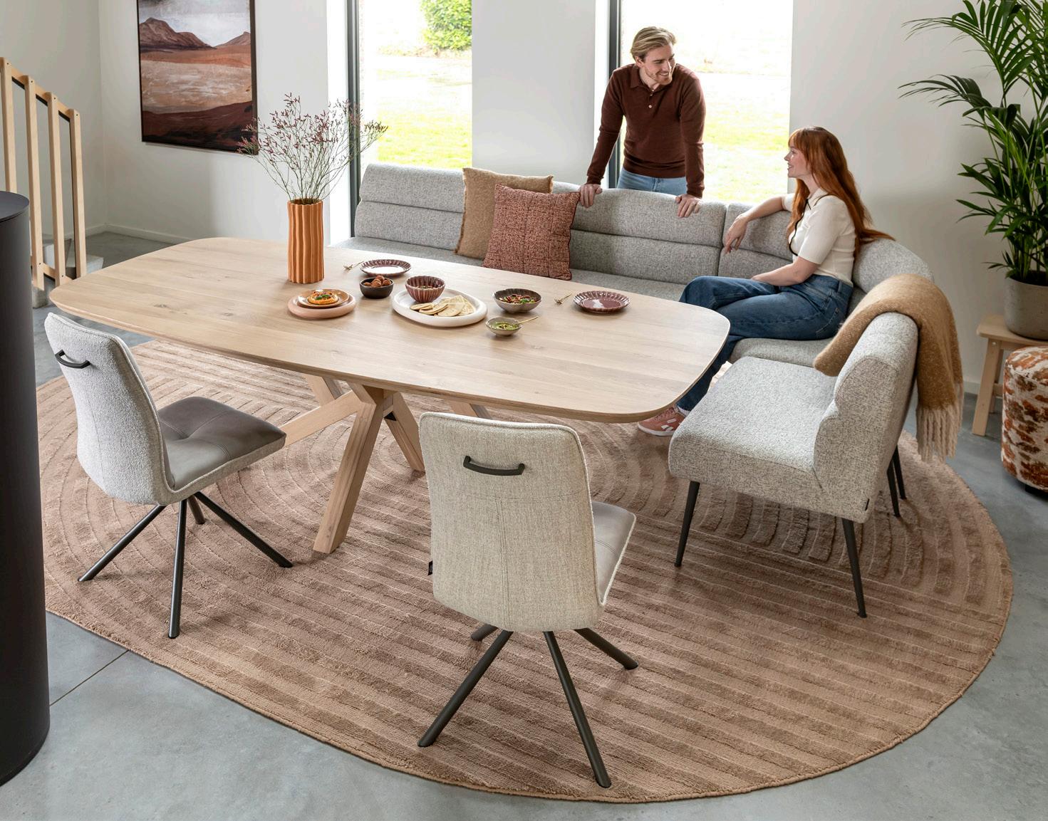 stoel Milva vanaf 259,- (afgebeeld in snel leverbare stofcombinatie Pala/Luton) | tafel Shimla verkrijgbaar in diverse maten vanaf 1599,- | 210x120cm 1699,hoekbank Jace bestaande uit: 170cm, hoek en 80cm vanaf 1747,- (afgebeeld in snel leverbare stof Luton) | stoel en eetkamerbank verkrijgbaar in diverse uitvoeringen