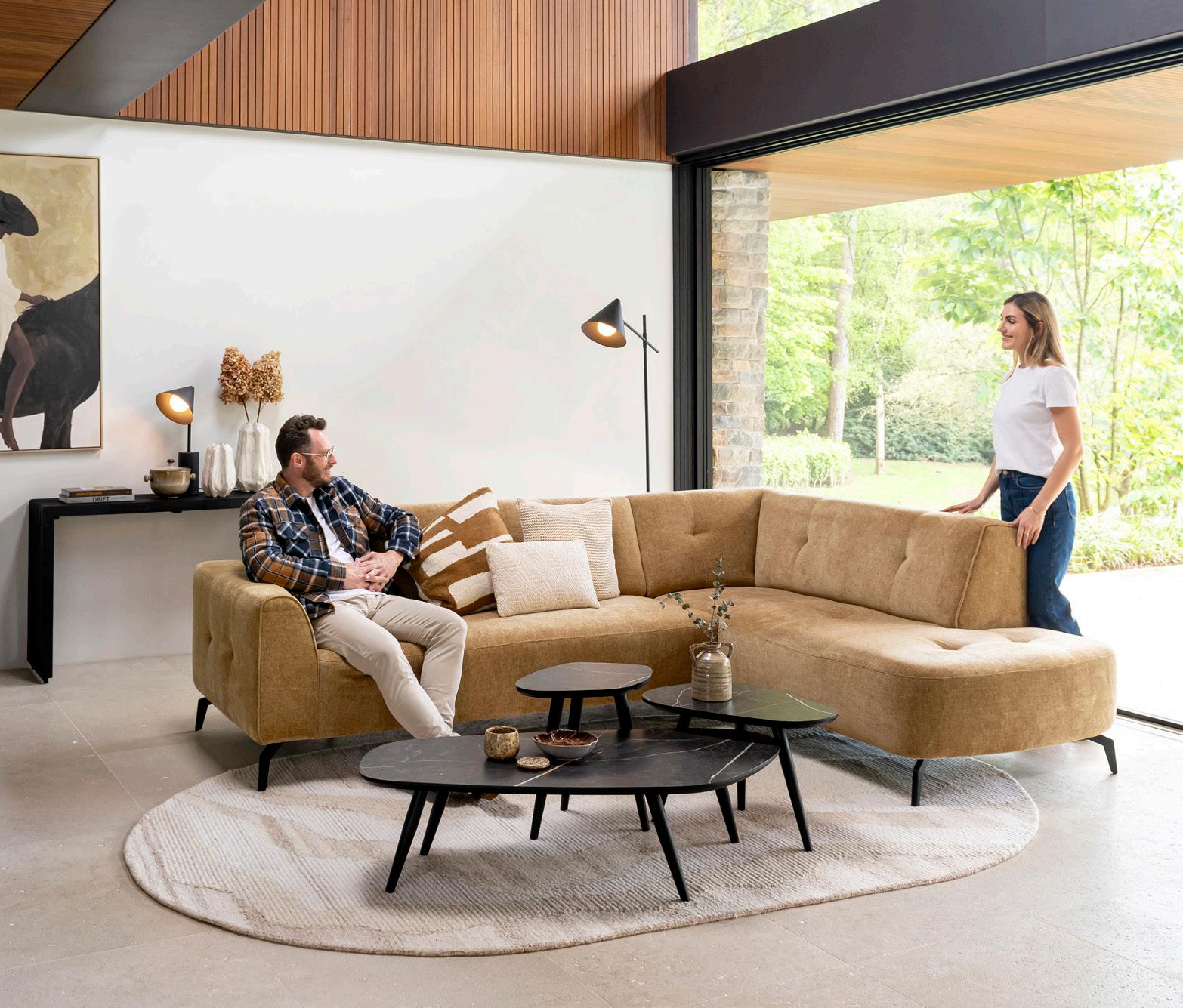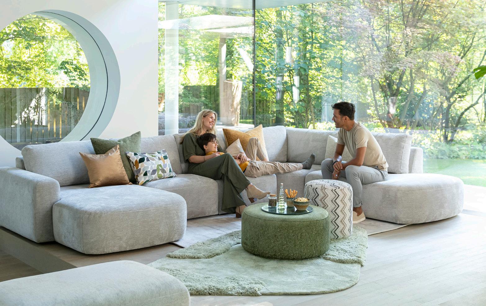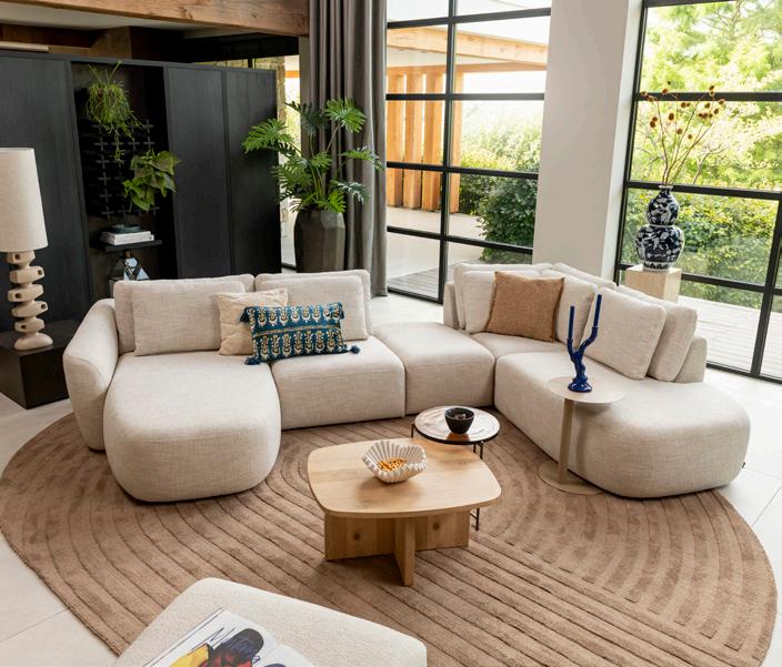 draaifauteuil Borgia, ø100cm vanaf 999,- | ø130cm vanaf 1099,(afgebeeld in stof Enzo) | bijpassende poef vanaf 499,- | salontafel Eloy 499,- | elementenbank Murcia bestaande uit: longchair, 2,5-zits zonder armen, hoek en kleine ottomane vanaf 4349,- (afgebeeld in stof Enzo) | bank en fauteuils verkrijgbaar in diverse uitvoeringen