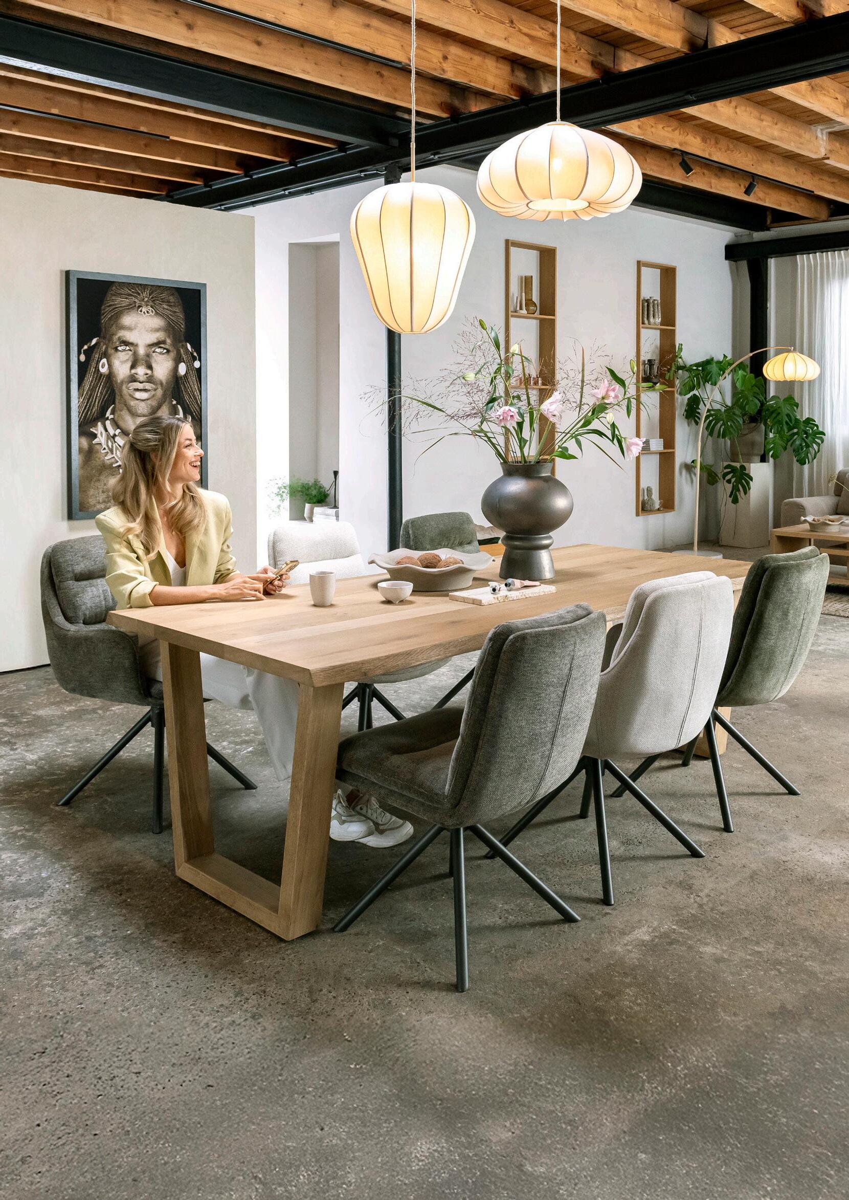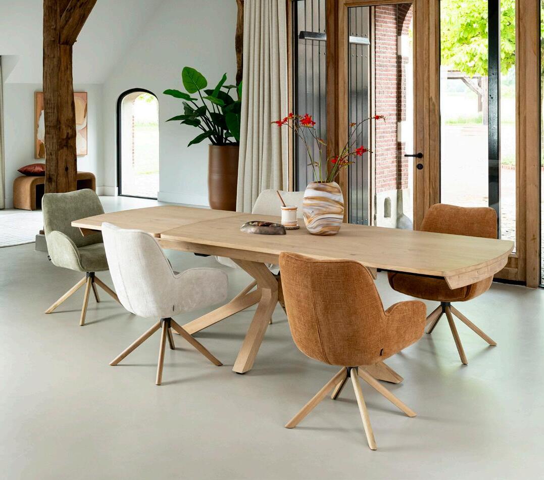 uitschuiftafel Preston 1399,- 1299,- | stoel Isaac 159,- 139,- | uitschuiftafel Nyon verkrijgbaar in diverse maten vanaf 1699,- 1499,170/230x100cm 1899,- 1699,- | stoel Riley vanaf 299,- 269,- (afgebeeld in stof Cadiz)