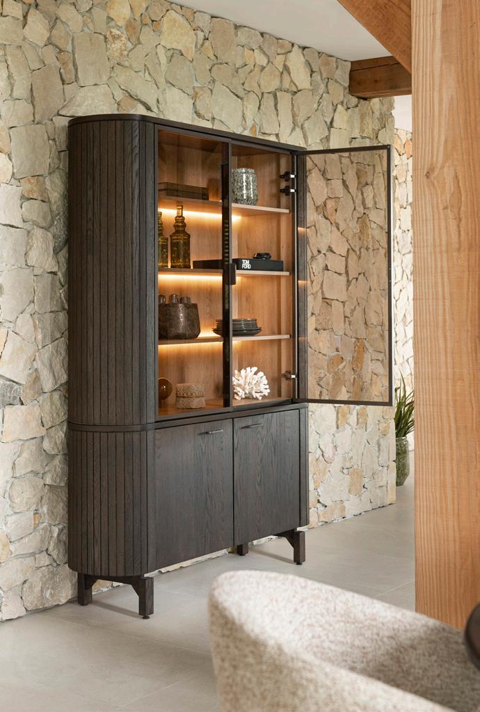 tafel Trapani verkrijgbaar in diverse maten vanaf 1199,- 1099,240x120cm 1499,- 1399,- | armstoel Nikolas met draaibare poot 299,- 269,- (afgebeeld in stof Enzo) | ook verkrijgbaar als barstoel highboard Trapani met ledverlichting 1299,- 1199,-