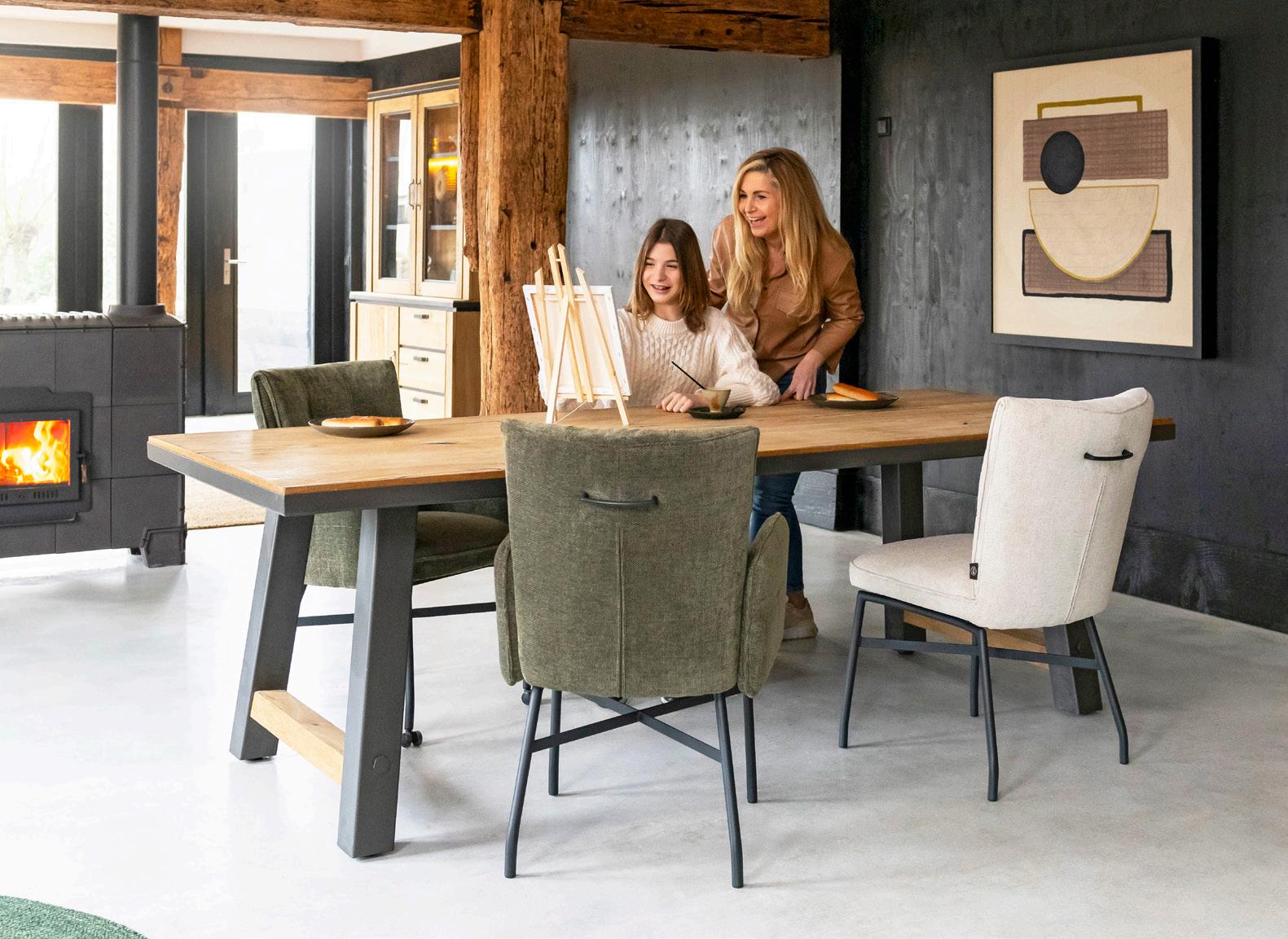 tafel verkrijgbaar in diverse maten vanaf 699,- | 180x108cm met centrale poot 999,- | stoel Bell 186,- 149,armstoel 225,- 180,- (afgebeeld in stofcombinatie Calabria met Vada) dressette met ledverlichting 1299,1199,- | relaxfauteuil Florence met poef 619,- 499,-