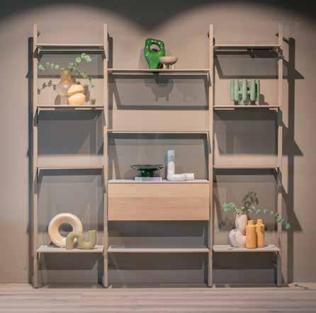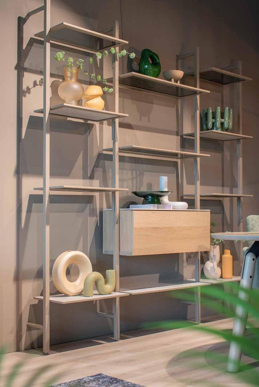 Een open wandkast die u zelf helemaal naar wens kunt indelen, met staanders in 3 verschillende hoogtes, schapdragers in 2 breedtes, leggers van Dekton, glas, noten- of eikenfineer en/of een inzetblok om spullen uit het zicht op te bergen. De metalen delen zijn verkrijgbaar in tientallen lakkleuren: zo wordt de kast een geheel met uw wand en creëert u een galerie-achtige sfeer. Ontworpen door Hans Daalder.