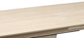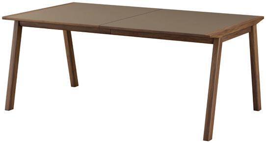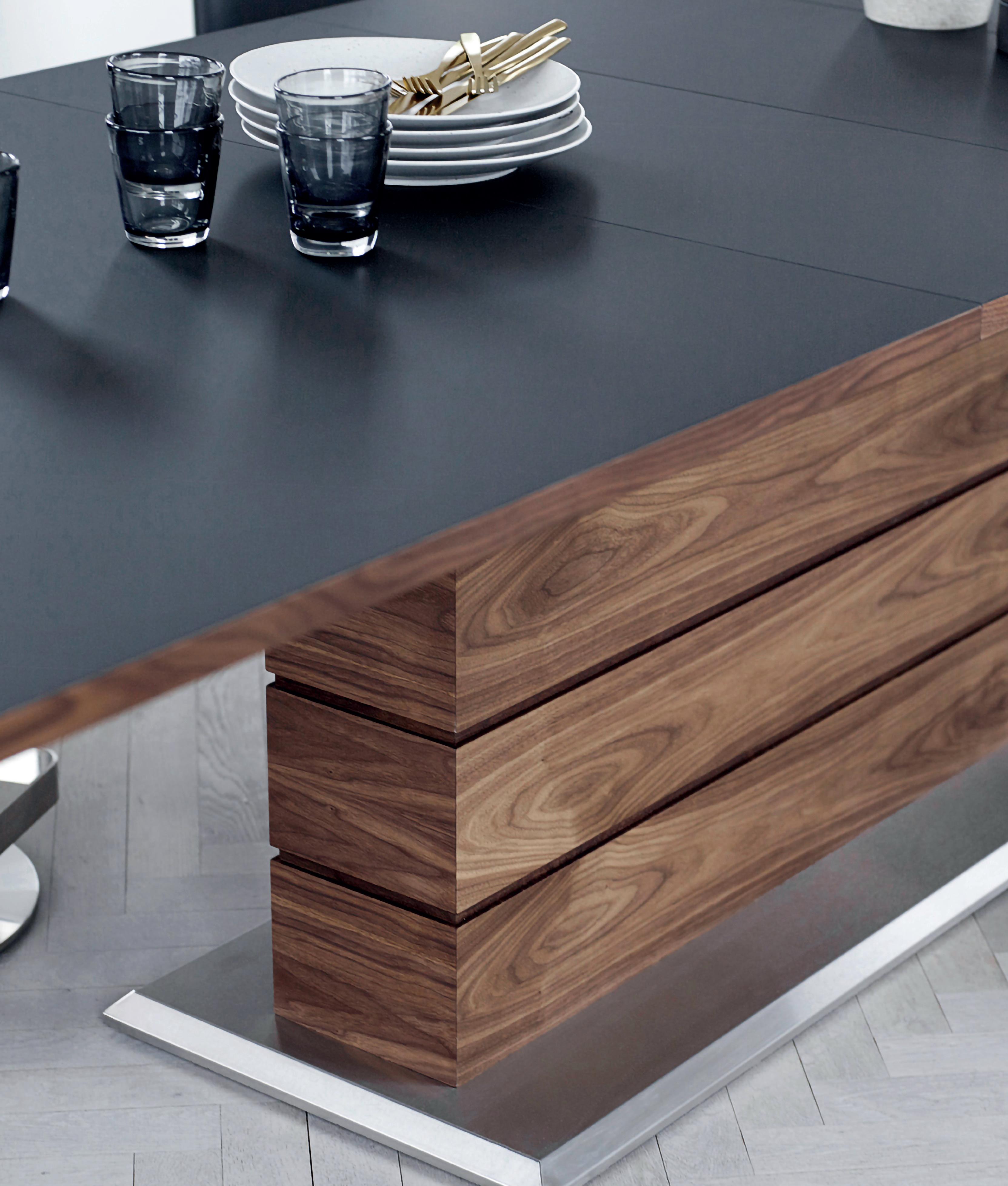 The dynamic appearance of the dining table is emphasized by an undivided tabletop and have a patented extension system; a light push to the tabletop reveals the hidden extension leaf, which is easily put into place in continuation of the dining tabletop. The dining table will seat 14 people when fully extended.