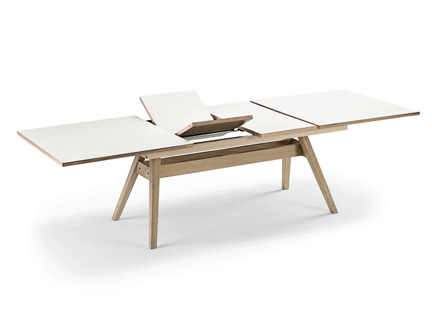 The butterfly extension mechanism smoothly unfolds two hidden leaves, increasing the seating capacity from 6 to 12 people. The sloping legs create a sharp profile and sculptural, modern appearance.