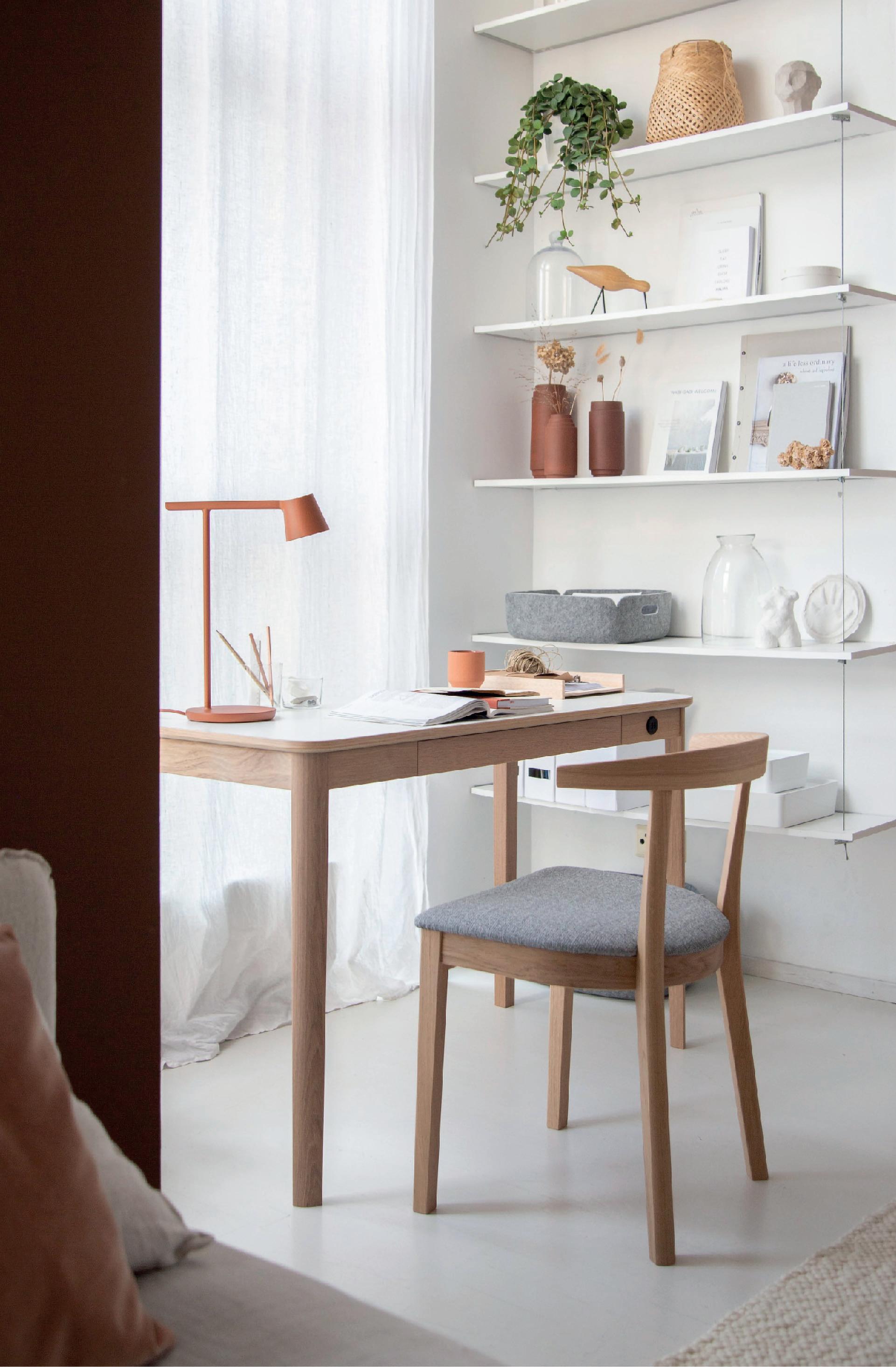 The simple and light design takes up minimal space in the home while still providing a practical workspace with pre-installed USB plug-ins, a spacious drawer and velcro straps for cords and cables.