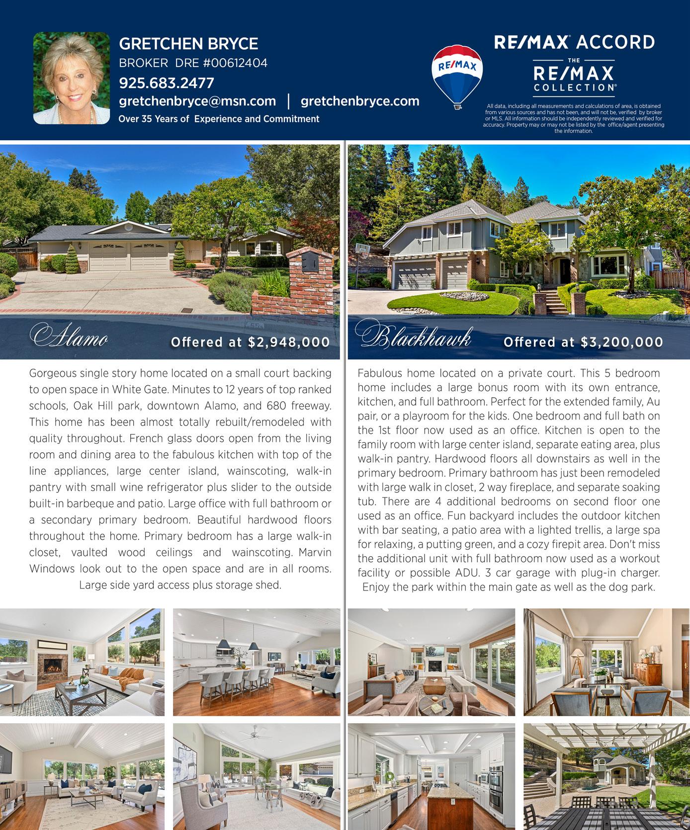 237 Still Creek Road • Danville ACTIVE $4,998,800 5 Bed 4 Full + 3 Half Bath 5,829 Sq Ft 0.48 Acres 4-Car Garage 237stillcreekrd.com 599 Justin Morgan Drive • Alamo SOLD $4,213,000 4 Bed 3 Full + 2 Half Bath 4,679 Sq Ft 0.53 Acres Represented Seller 2020 Victorine Road • Livermore ACTIVE $16,898,800 5 Bed 5 Full + 2 Half Bath 8,144 Sq Ft 106.65 Acres 2020victorinerd.com LIFETIME TRANSACTION VOLUME $1.5B+ LIFETIME HOMES TRANSACTED 1,300+ WSJ/REAL TRENDS 2022 #80 EXPERIENCE IN REAL ESTATE 38Y+ AGENT IN BLACKHAWK 2013-2021 MLS #1 Real Estate Needs? ...Leaf It To Me! Sold in 6 days!Featured Property 20