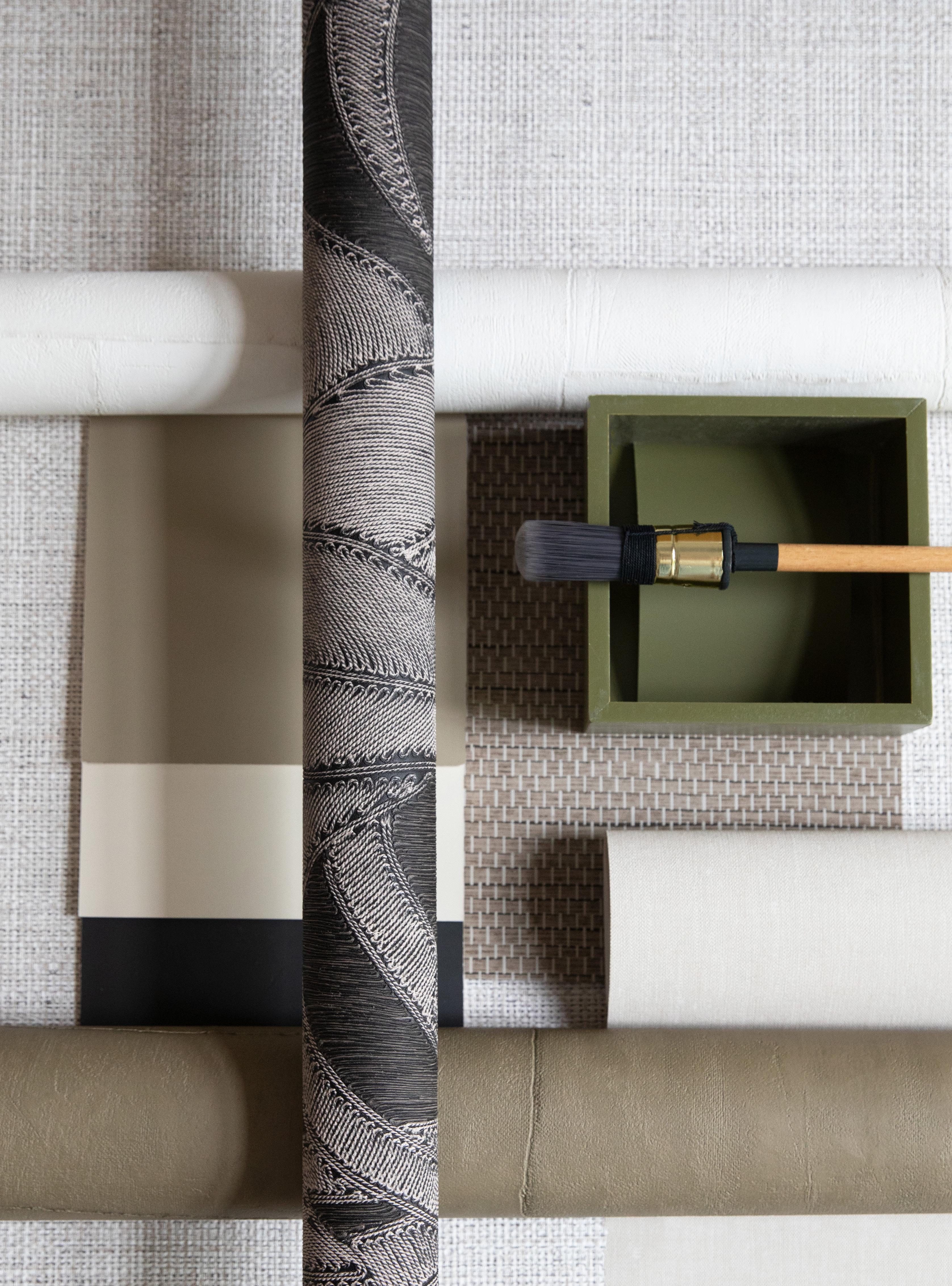 In dit materiaalboard zie je verschillende texturen, structuren, patronen en kleuren uit onze verf en wandbekledingsselectie, die bestaat uit behang, wandbekleding, renovatievlies, duurzame lijnolie muurverf en lakverf (ook voor de buitengevel van je huis).