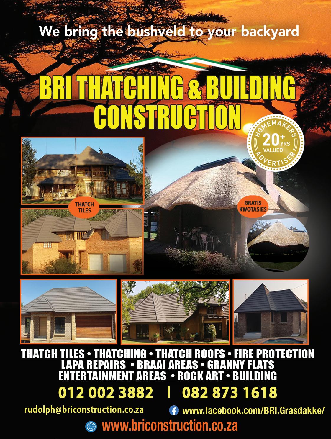 HOMEMAKERS JULY 2023 18 • PRETORIA Willie’s PAVING & PROJECTS Domestic • Commercial • Industrial • 5 Year Guarantee 073 863 3828 066 523 8239 For satisfaction try ys we are willing & able. Paving and Cladding williespavee@gmail.com 083 288 5138 Arnold 083 778 6462 Elzaan For all your Thatch & Thatch Tile Roof requirements call us www.thatchgalore.co.za info@thatchgalore.co.za THATCH ROOFS & THATCH TILE ROOFS 083 504 7765 CALL TODAY 012 331 2254 mju@absamail.co.za New Homes Building Plans Additions / Alterations