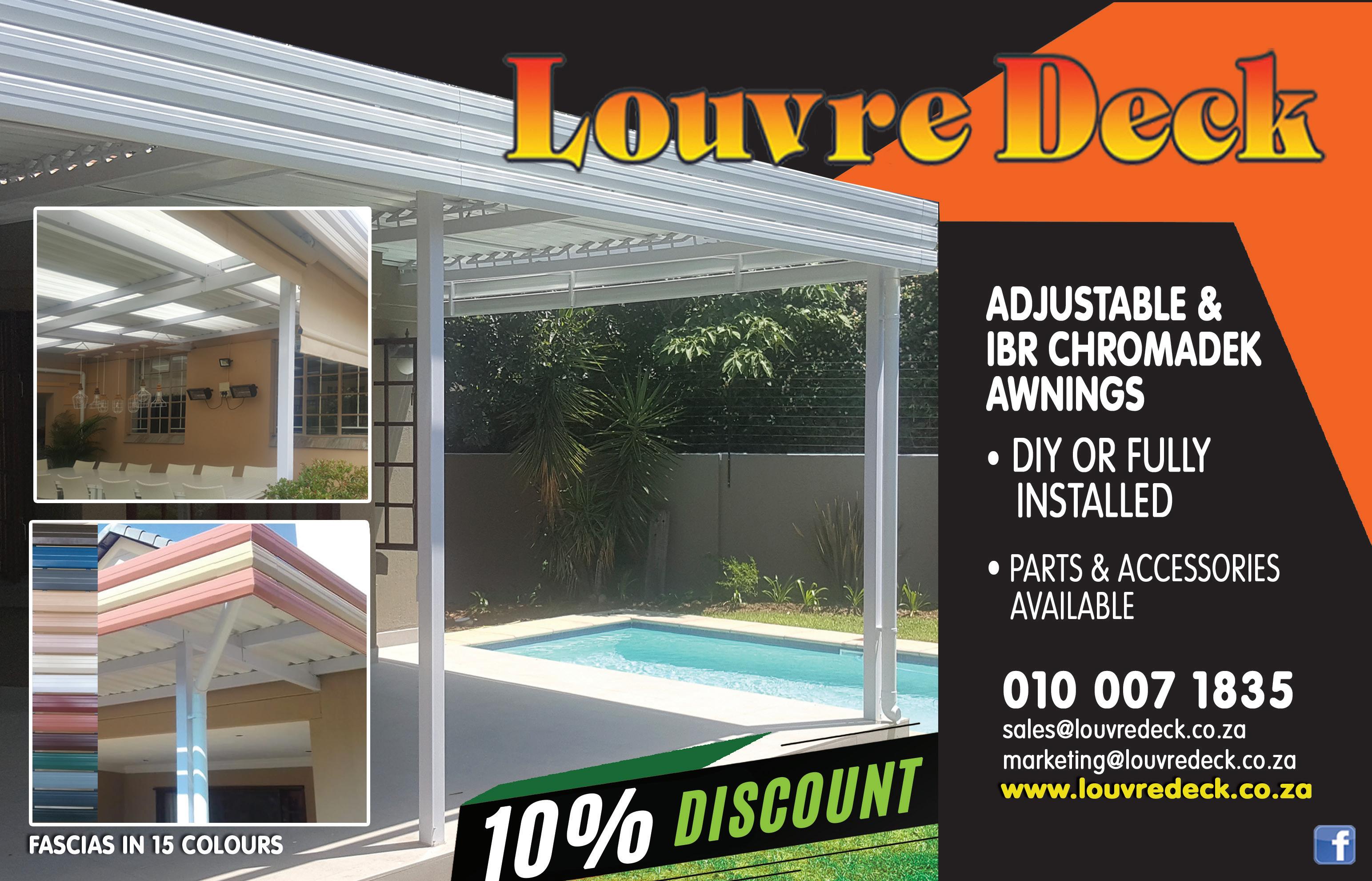 TO ADVERTISE PHONE 0861 11 4663 SECURITY EXPERTS WE KEEP YOU SECURED Johan: 082 377 9641 sectronix@vodamail.co.za • Gate motors • Alarms Systems • Electric Fencing • CCTV Sectronix Security FOR ALL YOUR SECURITY NEEDS FREE Assessment of your existing security 082 377 9641 BLINDS & ENCLOSURES OUTDOOR Entertainment area | Patio | Veranda | Thatch We also offer - RIPSTOP & CANVAS We Service the entire Gauteng Quality and service at an affordable price! KEEP OUT THE COLD! Written Guarantee CALL NOW FOR YOUR FREE QUOTE Craig: 082 568 7608 info@rapidblinds.co.za www.outdoorblinds.co.za Credit Card Payments Accepted SHEARWEAVE - Stop the heat, keep the view! 25 YEARS EXPERIENCE 012 770 3229 076 546 3212 Free quotes awning restorations@gmail com www unniquelouvres co za your outdoor space! modernize UNIQUE LOUVRES UNIQUE LOUVRES with We SPECIALIZE in: • Adjustable Louvre Awnings • IBR Chromadeck Carports • Window & Door Canopies • DIY Products also available CLOSED OPEN SPECIALS ON WATERPROOFING & ROOF SPRAYING • Damp & Waterproofing • Torch-on System • Roof Buddy’s • Fascia & Barge Boards • Roof Spray • Seamless Gutters • Interior & Exterior Painting • Ceilings • Carports & Palisades Installation of Solar Panels & Invertors Roof Experts EXPERTS YOU CAN TRUST