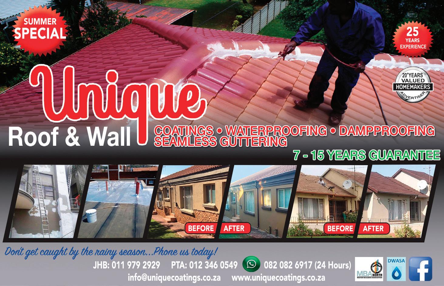 PRETORIA • 17 TO ADVERTISE PHONE 0861 11 4663 ROOF & WALL COATINGS Also specialising in: WATERPROOFING • DAMPPROOFING • SEAMLESS GUTTERING 7-15 Years Guarantee CALL NOW! SPECIAL WINTER Don’t get caught by the rainy season... Call us today! 082 082 6917 (24HRS) www.uniquecoatings.co.za • info@uniquecoatings.co.za 25 YEARS EXPERIENCE PTA: 012 346 0549