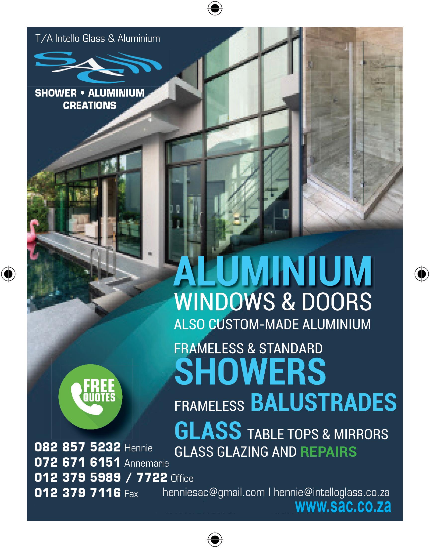 HOMEMAKERS JULY 2023 4 • PRETORIA WWW.HOMEMAKERSONLINE.CO.ZA 083 658 0316 060 565 2824 011 473 0212 WE SERVICE THE GREATER GAUTENG nicolene@alumint.co.za www.alumint.co.za Alumint - aluminium and glass specialists CONVERSIONS DONE IN 1 DAY FROM STEEL / WOOD TO MODERN ALUMINUM SUNFLEX APPROVED AGENT • PATIO ENCLOSURES • SPECIAL CUSTOM DESIGNS • NEW HOMES • SLIDING FOLDING DOORS ALUMINIUM WINDOWS & DOORS MANUFACTURERS & INSTALLERS OF EST. 2011 • FRAMELESS SLIDING FOLDING DOORS • FRAMELESS SLIDING DOORS