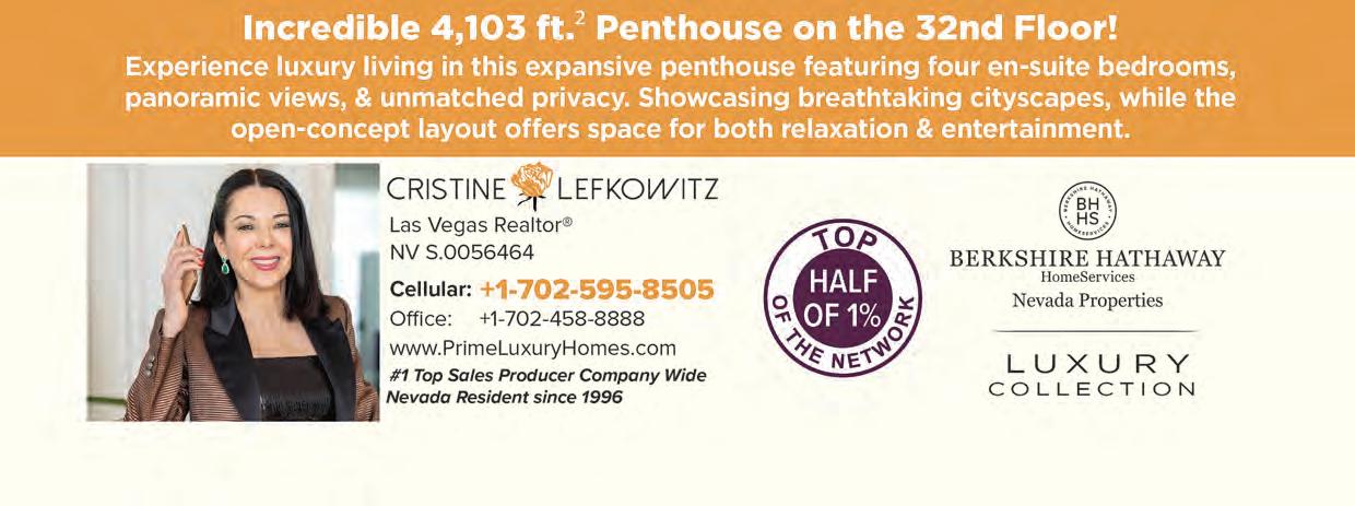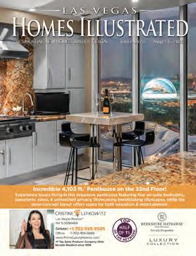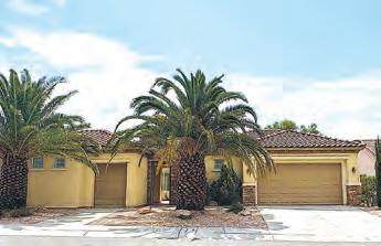shower. Bedrooms ensuite with custom closets. One downstairs bedroom with exterior entry and driveway, upstairs bedroom with balcony. Downstairs o ce with sliding doors and pool bath. Immerse yourself in the resort style exterior space that includes pool, spa, putting green, multiple patio areas with wood accented ceilings, re feature and built-in outdoor kitchen area. O ered at $7,488,000. Call Patty at 702-281-4141 for more information and your private tour!