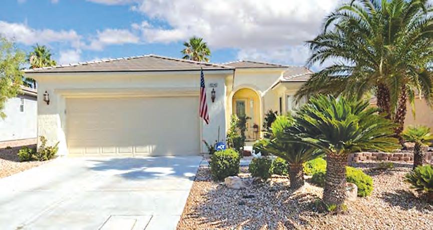 fairway – ladies tee. Fenced courtyard greets you as you enter this popular Laurel Model with 2 BRs and exible room for den/study/o ce etc. Shutters throughout. Primary bedroom with large bathroom, also features a large walk-in closet with extensive organization. Bedrooms and den have ceiling fans. Great room with kitchen/living room/dining area all look out to the golf course. Large covered patio overlooks golf course with wood slatted west sunscreen for full patio enjoyment plus privacy. Water heater and the HVAC were replaced in 2024. Ideal 55+ active community with tennis, pickle ball, clubhouse, tness center, community golf, indoor pool & spa, social calendar & clubs. Situated close to shopping, restaurants, all services, 1-215 freeway access and entertainment o ered at Aliante Hotel & Casino. Reduced to $410,000. MLS #2677340 CALL ➠ 702-236-3800!