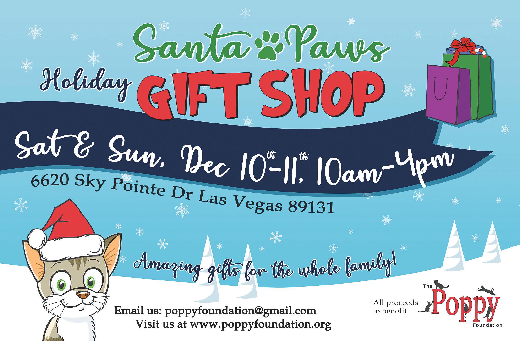 SANTA PAWS HOLIDAY GIFT SHOP 10am–4pm. Amazing gifts for the whole family! All proceeds to benefit The Poppy Foundation. Get your holiday shopping done! Lots of new items! Hot cider, pictures with Santa & bake sale! The Poppy Foundation • 6620 Sky Point Drive