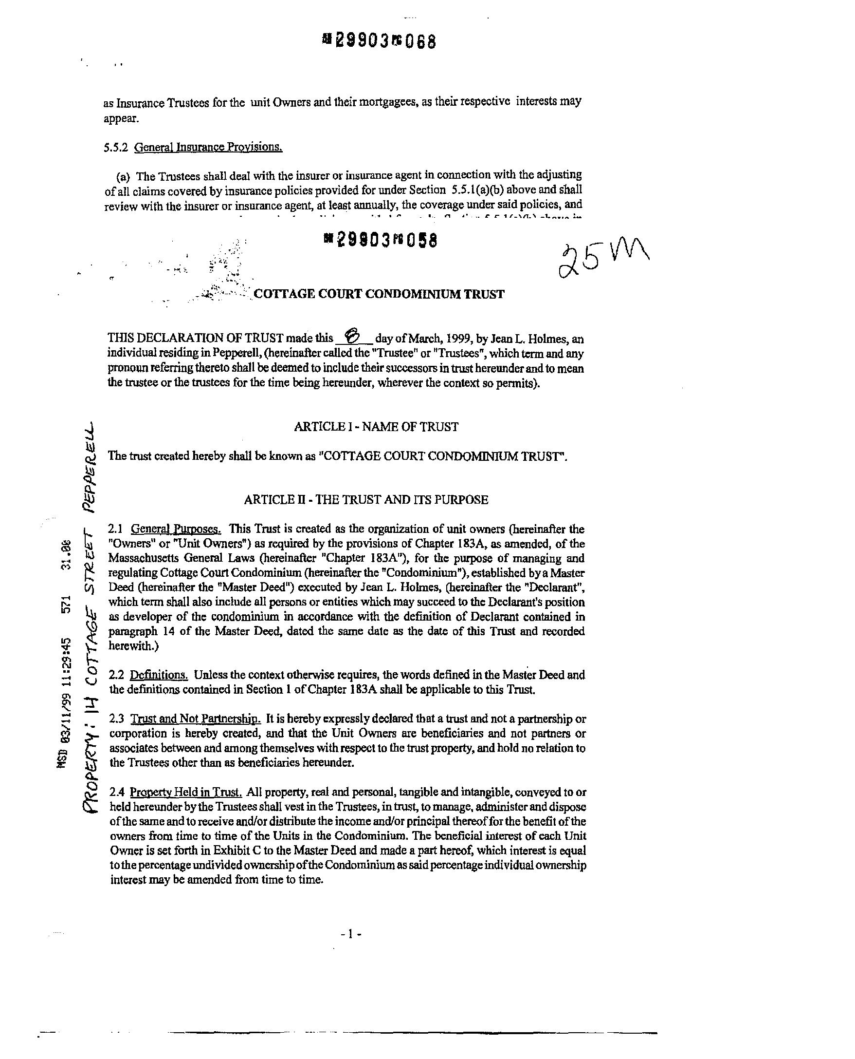 7.4 Disposition ofProperty onTermination Uponthetermination ofthis Trust. the Trustees may. subjectto andin accordance with theprovisions ofChapter l83A, sell and convert into money the whole ofthe trust property, or any part or parts thereof, and, after paying or retiring all known liabilities and obligations ofthe Trust and providing for indemnity against any other outstanding liabilities and obligations, shall divide the proceeds thereof among, and distribute in kind (at valuations made by them which shall be conclusive) all other property then held bythem in trust hereunder to the Unit Owners as tenants in common, according to their respective percentages of beneficialinteresthereunder.Inmakinganysale underthisprovision,theTrusteesshall havepower to sell or vary any contract ofsale and to do all things, including the execution and delivery of :a£imII1Mla,, "& 7UtlJ 'Ul mmlt1a. =111 t:uraret*Cttltl•ltieJ:cW/lr1. '?ra:: powers ofsale and all other powershereingiven to the Trustees shall continue as to all property at any time remaining in their possession or ownership, even though all times herein fixed for distribution oftrust propertymayhave passed.