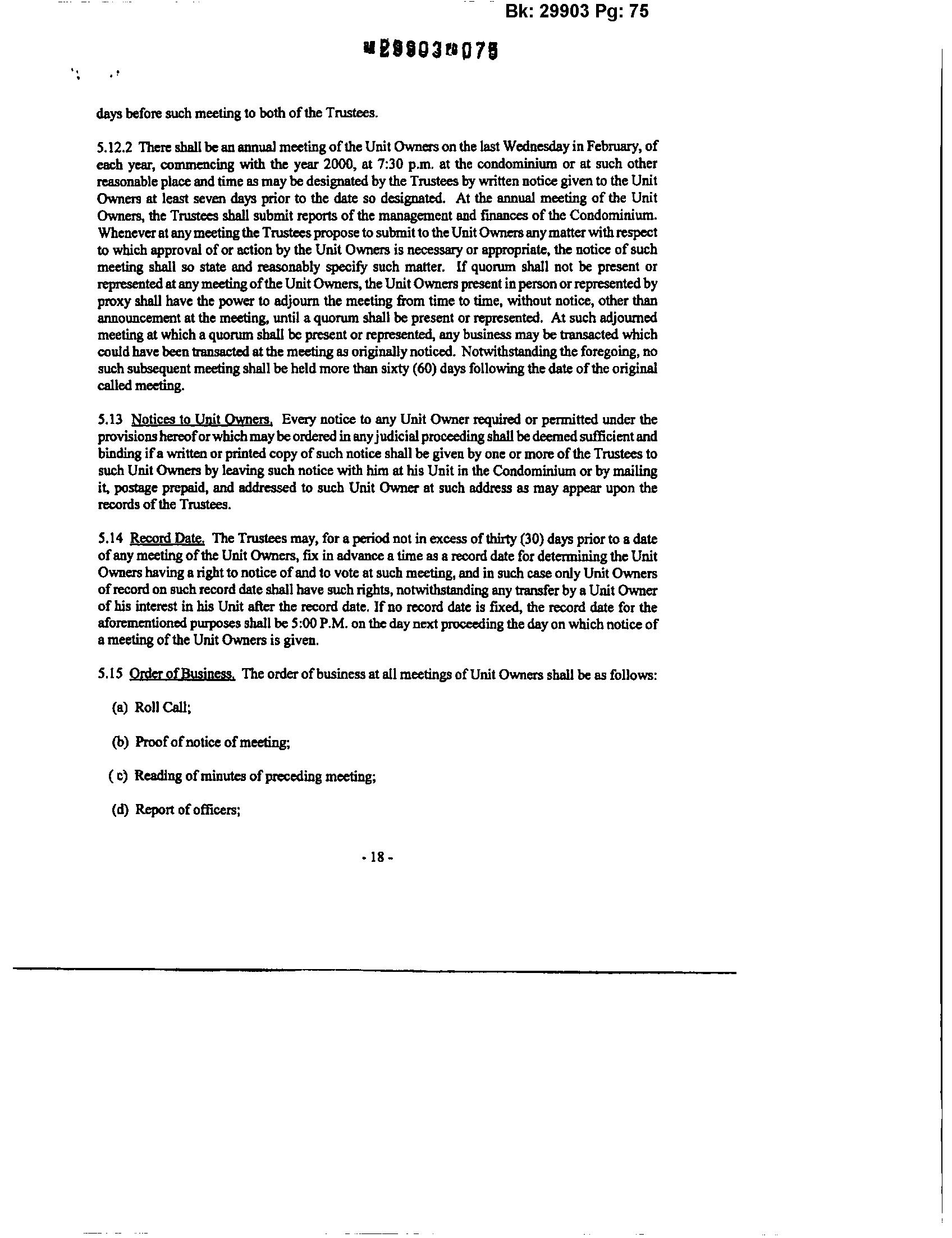 S.12.2 There shall be an annual meetingofthe Unit Owners onthe last Wednesdayin February, of each year, commencing with the year 2000, at 7:30 p.m. at the condominium or at such other reasonableplace and time as mayhedesignated bythe Trustees bywritten notice given to the Unit Owners at least seven days prior to the date so designated. At the annual meeling ofthe Unit Owners, the Trustees shall submit reports ofthe management and finances ofthe Condominium. WheneveratanymeetingtheTrusteesproposetosubmitto theUnitOwnersanymatterwithrespect to which approval ofor action bythe Unit Owners is necessaryor appropriate, the notice ofsuch meeting shall so state and reasonably specify such matter. If quorum shall not he present or representedatanymeetingoftheUnit Owners,theUnitOwners present inperson orrepresentedby proxy shall have the power to adjourn the meeting from time to time, without notice, otherthan announcement atthe meeting, until a quorum shall he present orrepresented. At such aqjoumed meeling atwhich aquorum shall he present orrepresented, anybusiness may be transacted which couldhavebeentransacted althe meeting as originallynoticed. Notwithstandingtheforegoing, no such subsequent meeting shall he held more than sixty (60) days following the date ofthe original called meeting.