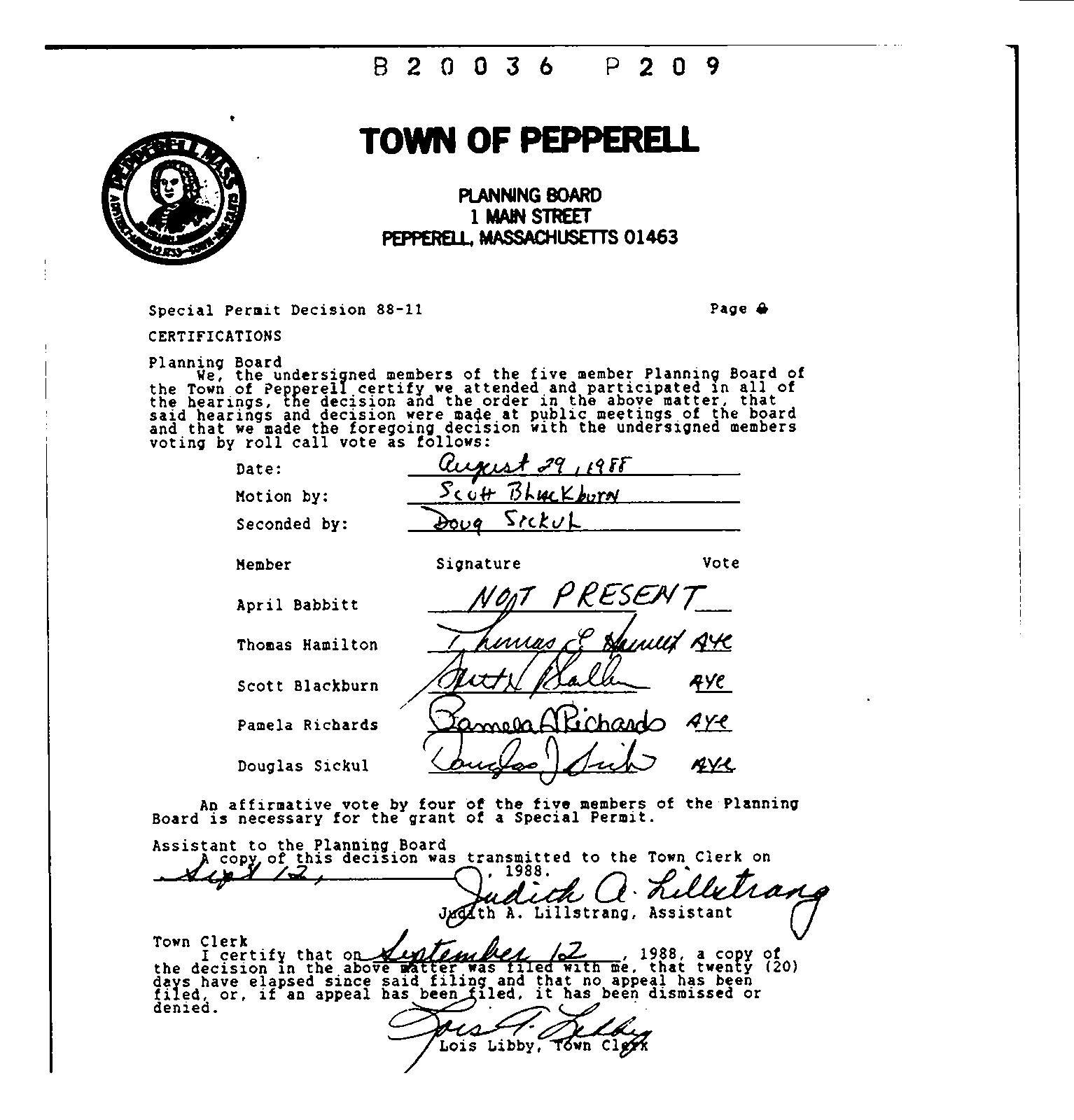 Planning Board Members present at the Hearing: Thomas Hamilton, April Babbitt, Scott Blackburn, Pamela Richards, Douglas Sickul.