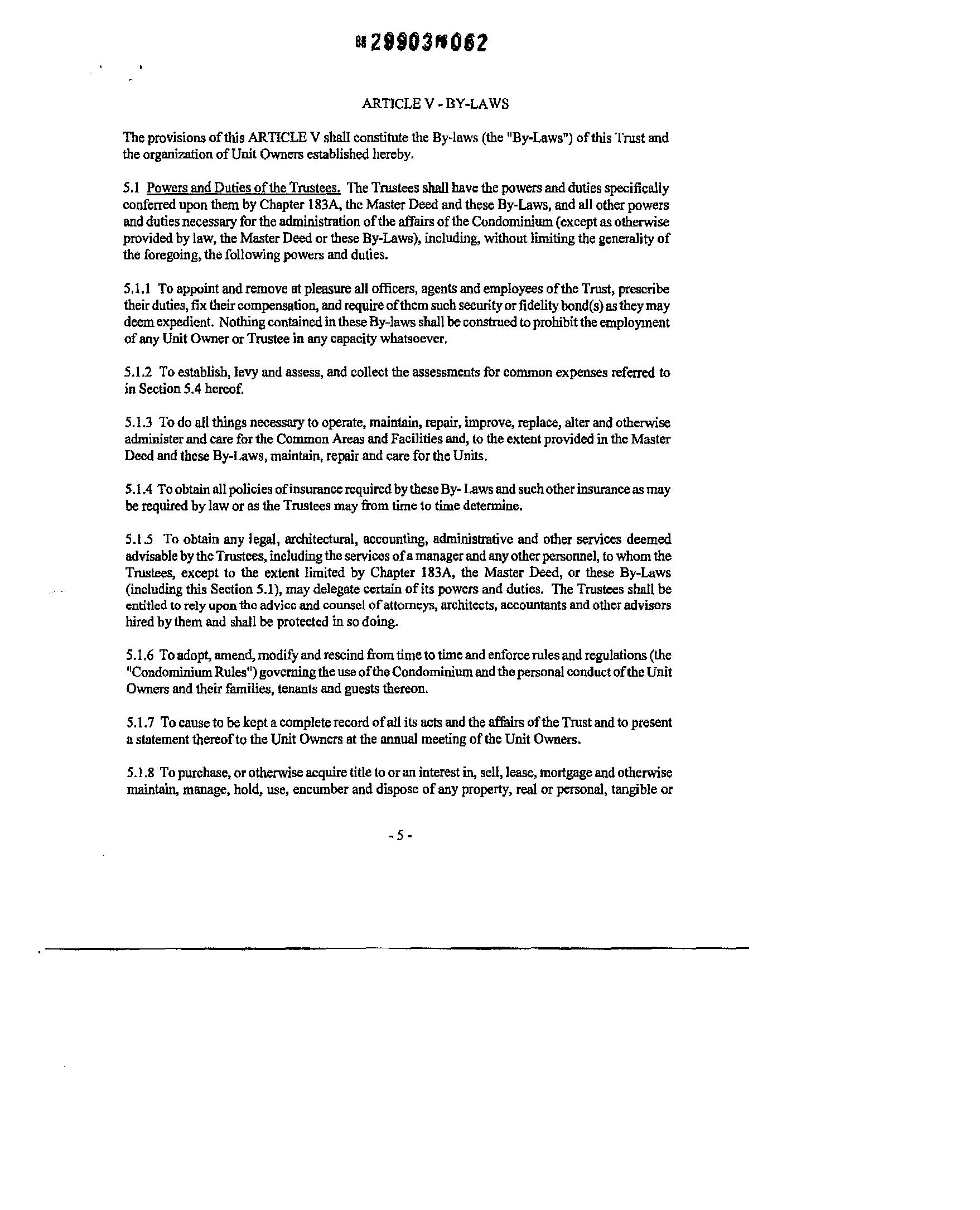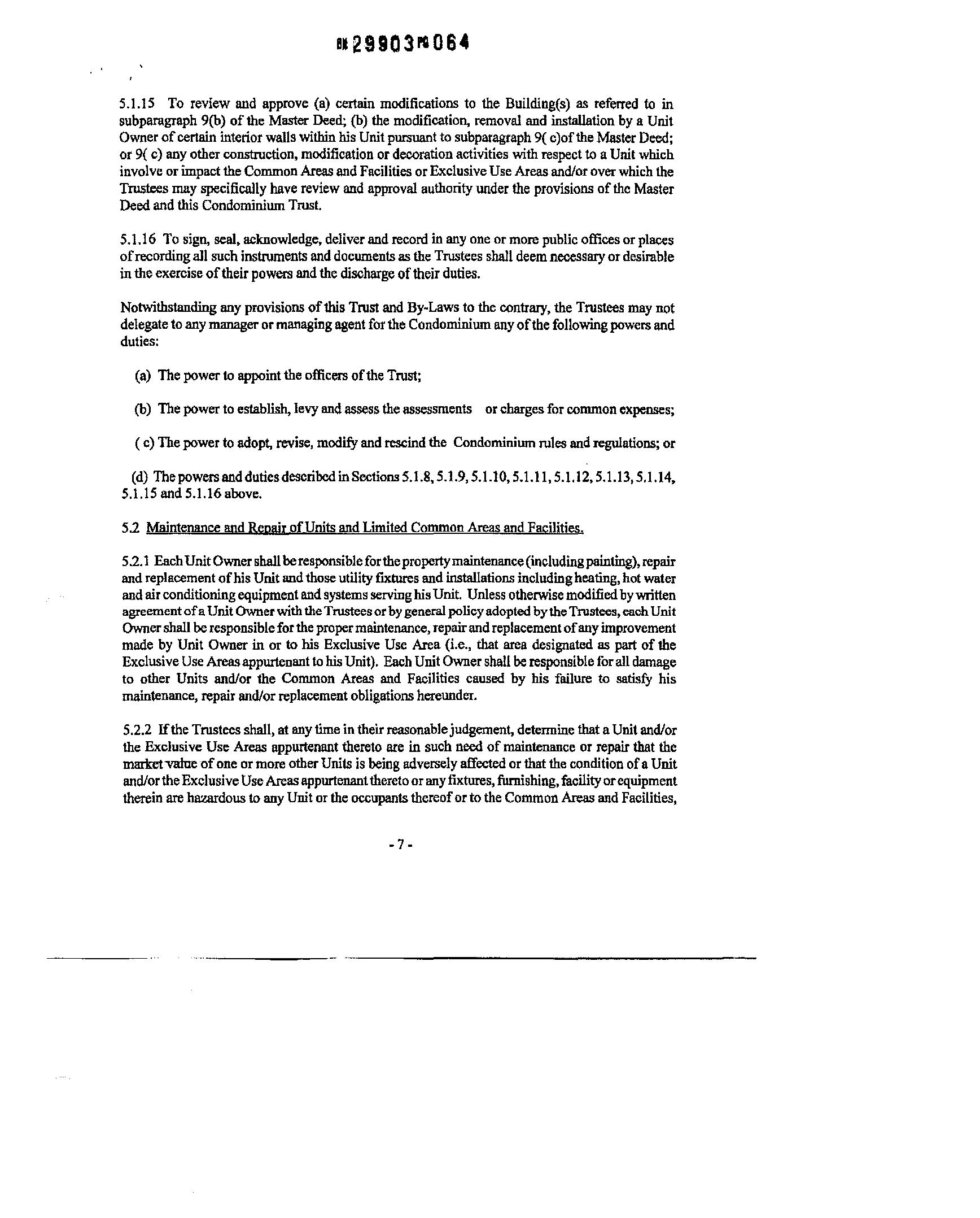 5.11 Manager. The Trustees may hire or appoint a manager or managing agent to perform such dutiesintheadministratioq,managementandoperationoftheCondominium,includingtheincurring ofexpenses, the making ofdisbursements andkeeping ofaccounts,astheTrusteesshall from time totimedetermine. However, notwithstandingtheappointment ofsuchamanager,theTrusteesshall retainultimatecontrolovertheadministrstion,managementandoperationoftheCondominium,and theymaynotdelegate to suchmanagerthosepowersandduties specified under Section 5.1 hereof notdelegable, AnyagreementforprofessionalmanagementoftheCondominiumshallbeterminable without cause and without incurring payment of a termination fee on ninety (90) days (or less) written notice. The term ofsuch an agreement shall not exceedthree (3) years.