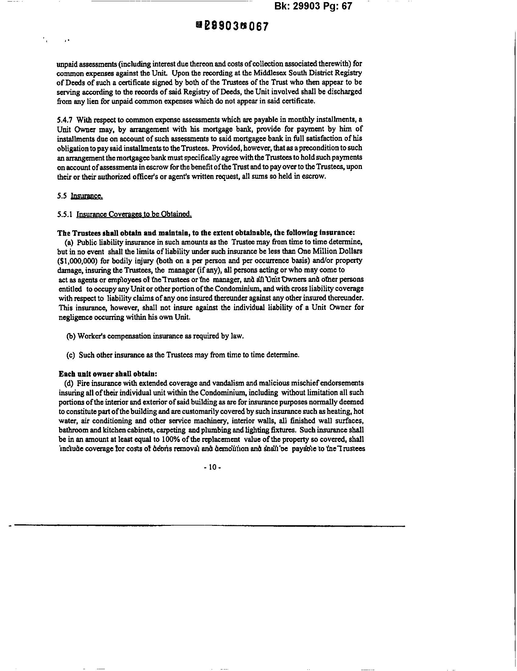 5.6.2. In the event that the total cost of repair or restoration as estimated on the basis of an independent appraisal, orasdetennined duringthe course ofrepair orrestoration,exceedsthe total sumofavailable insuranceproceeds,thentheTrustees sball assesstheUnitOwners""1oseunitsare physically affect bysaiddamage the amountinexcess ofavailableinsurance proceedsnecessaryto cover the cost ofrepairing or restoring improvements to aUnit; Furthermore, the cost ofrepair or restoriog ofimprovements which improvements exceeded avalue of$1,000 whenthey were made (saidvalueto be detennined bythe reasonablejudgementofthe trustees) and were not reported to the trustees as required by Section5.5.2(e) hereof, sball be borne exclusivelybythe Owner ofthe unit involved; and provided furtherthat ifthecasualtyloss exceedsten percent (10%) ofthe value ofthe Condominium as described inSection5.6.1(b) hereofand ifsuchexcess costofrepairs over available insurance proceeds exceeds ten percent (10%) ofthe value ofthe Condominium priorto thecasualty, anyUnit Ownernotagreeing as provided inthis sectionto proceedwiththerepairand restorationmayapplytotheMiddlesex CountySuperiorCourt,onsuchnotice tothe Trusteesasthe Court shall for an order directing the purchase ofhis Unit bythe Trustees at the fuir market value thereofas approved bythe Court. The cost ofany suchpurchase shall bea common expense.