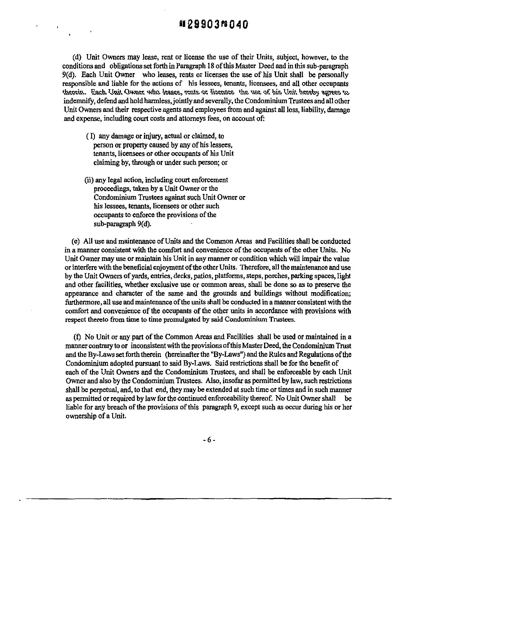 5.9.4 ByreviewingandapprovingaUnit OwnersProposedWork,theTrusteesare not undertaking nor shall they therebyassume any liability orresponsibility for thestructural orother soundness of theProposedWork;andeachUnitOwnerforhimself,hisfamilyand allothersclaimingby,through orunderhim, includingall guests, lessees,tenants, licenseesandotheroccupants ofhisUnit,hereby irrevocablyreleaseseachoftheTrusteesfromanyandall liabilityonaccountofanyerrorsordefects in or failmes or omissions with respect to the plans and specifications for and/or construction implementation ofthe Proposed Work. Jn addition, each Unit Owner who performs the Proposed - 16 -