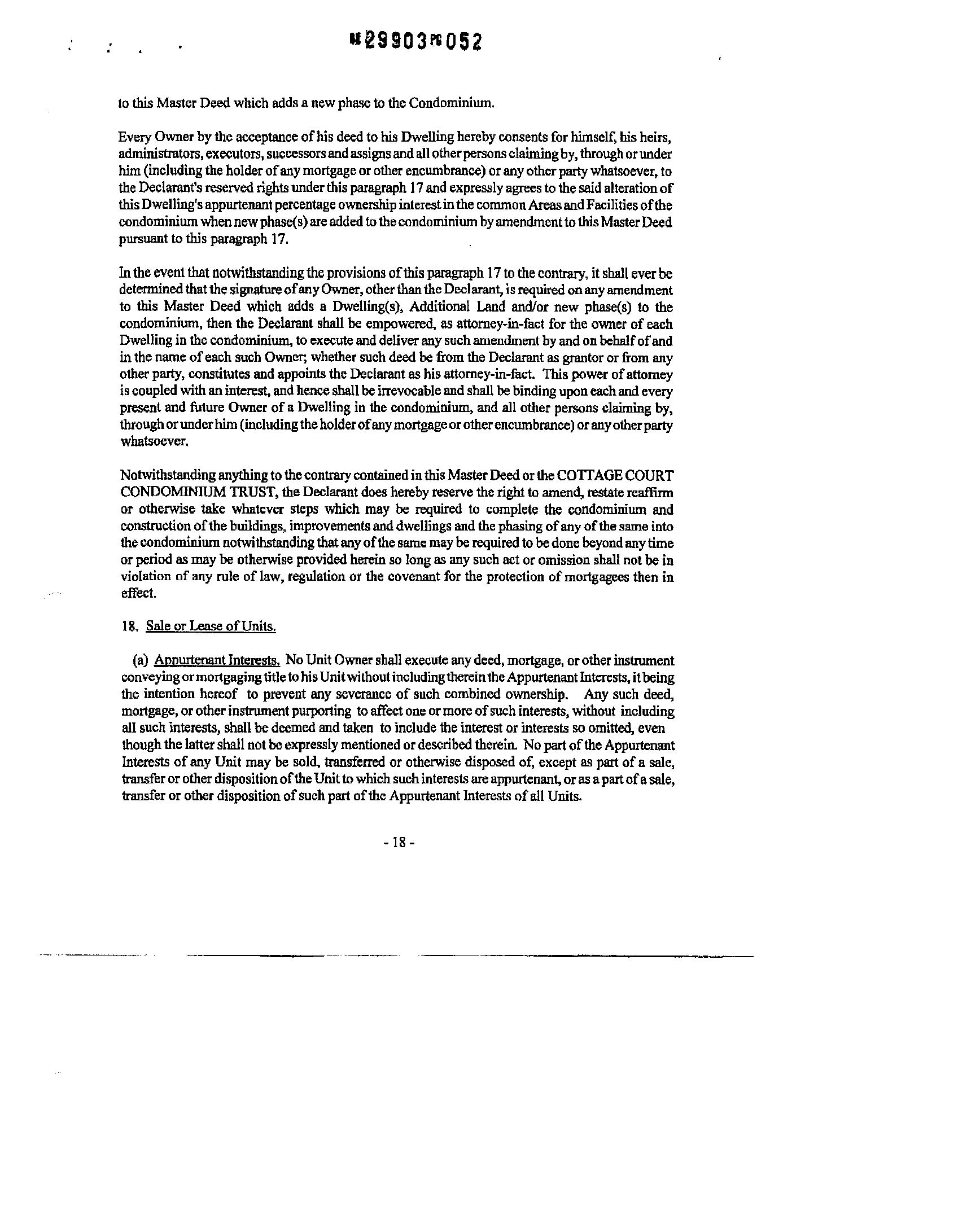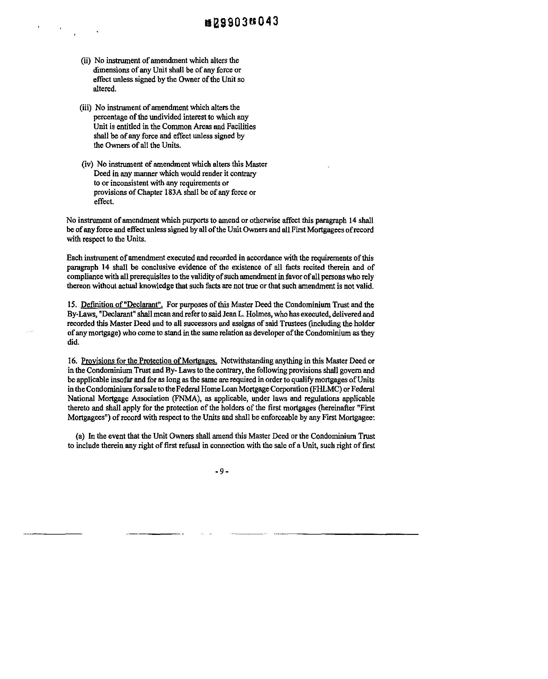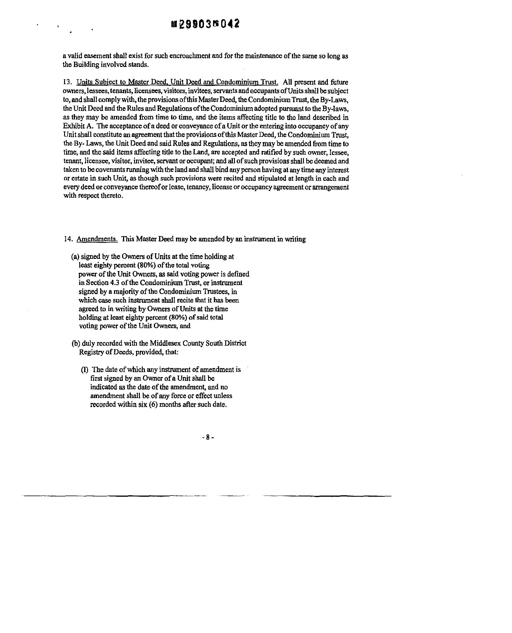 7.2 Necessity for Recording Amendments. Alterations. Additions. or Changes Any amendment, alteration,additionorchangepursuanttotheforegoingprovisionsoftheARTICLEVllshallbecome effective upon the recording withtheMiddlesexSouthDistrict RegistryofDeeds ofan instrument ofamendmen' alteration, addition orchange, as thecasemaybe, signed, sealedandacknowledged inthemannerrequired for the acknowledgmentofdeeds bya majorityofthe Trustees,settingfonh in full the amendmen' alteration, addition or change and reciting the consent ofthe Unit Owners herein required toconsentthereto. Suchinstnnnen' so executedand recorded, shall be conclusive evidence oftheexistenceofall facts andofcompliance withtheprerequisitesto thevalidityofsuch amendment, alteration, addition or change, whether stated in such instrument or not, upon all questions as to title or affecting the rights ofthird persons and for all other purposes.