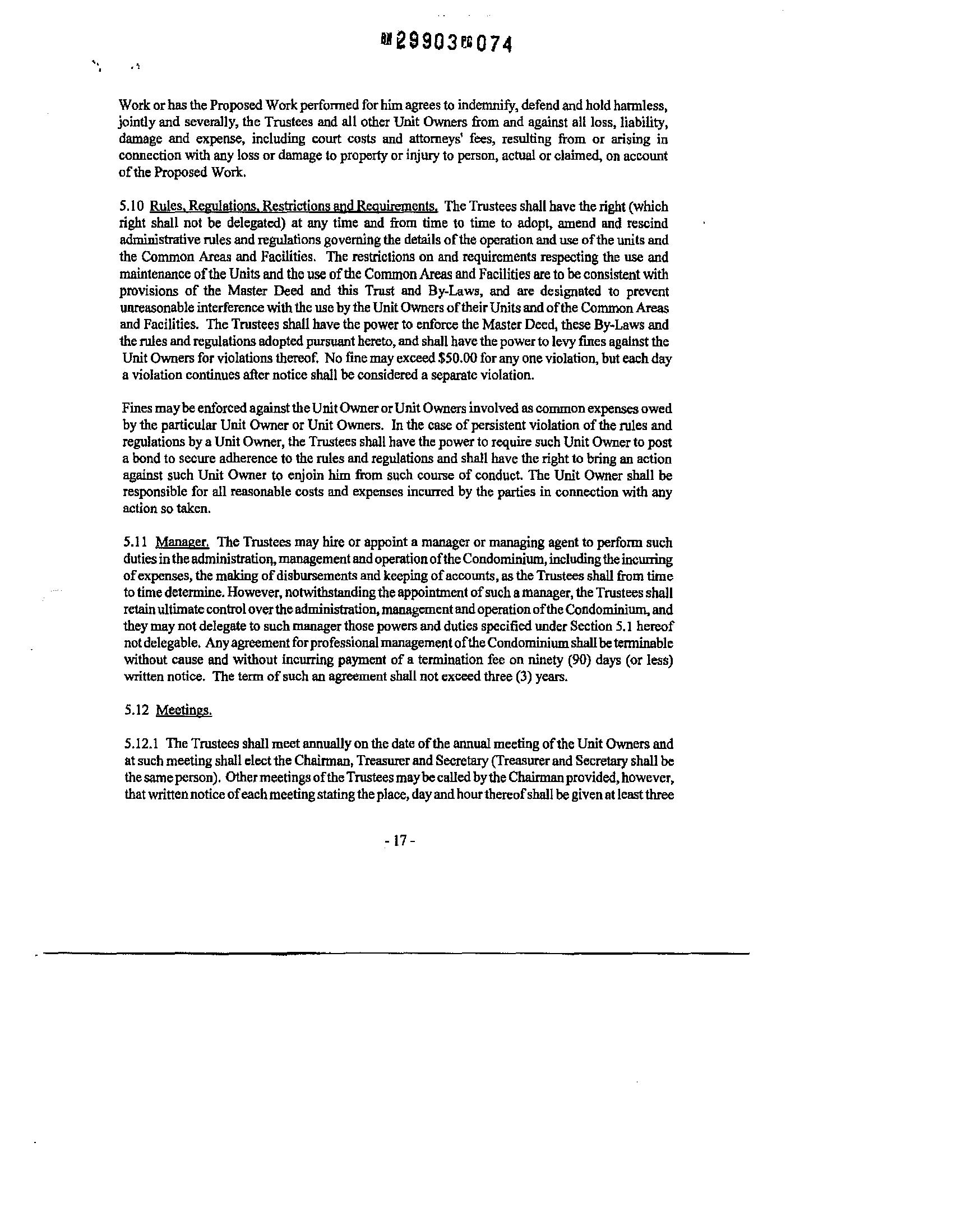 5.10 Rules, Regulations, Restrictions and Reouirements, The Trustees shall have theright (which right shall not be delegated) at any time and from time to time to adopt, amend and rescind administrativerules and regulations governingthe details ofthe operationanduse ofthe units and the Common Areas and Facilities. The restrictions on and requirements respecting the use and maintenance ofthe Units and the use ofthe Common Areas and Facilitiesareto beconsistentwith provisions of the Master Deed and this Trust and By-Laws, and are designated to prevent unreasonable interferencewiththe usebytheUnitOWnersoftheirUnitsandofthe CommonAreas and Facilities. The Trustees shall have the power to enforce the MasterDeed, these By-Laws and therules andregulationsadoptedpursuanthereto,and shall havethepowerto levyfines againstthe Unit Owners for violations thereof. No fine mayexceed$50.00forany oneviolation, but eachday a violation continues afternotice shall be considered aseparate violation.