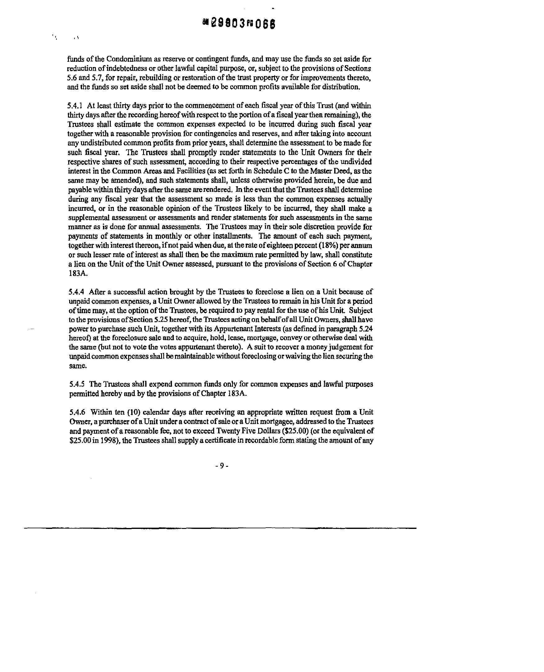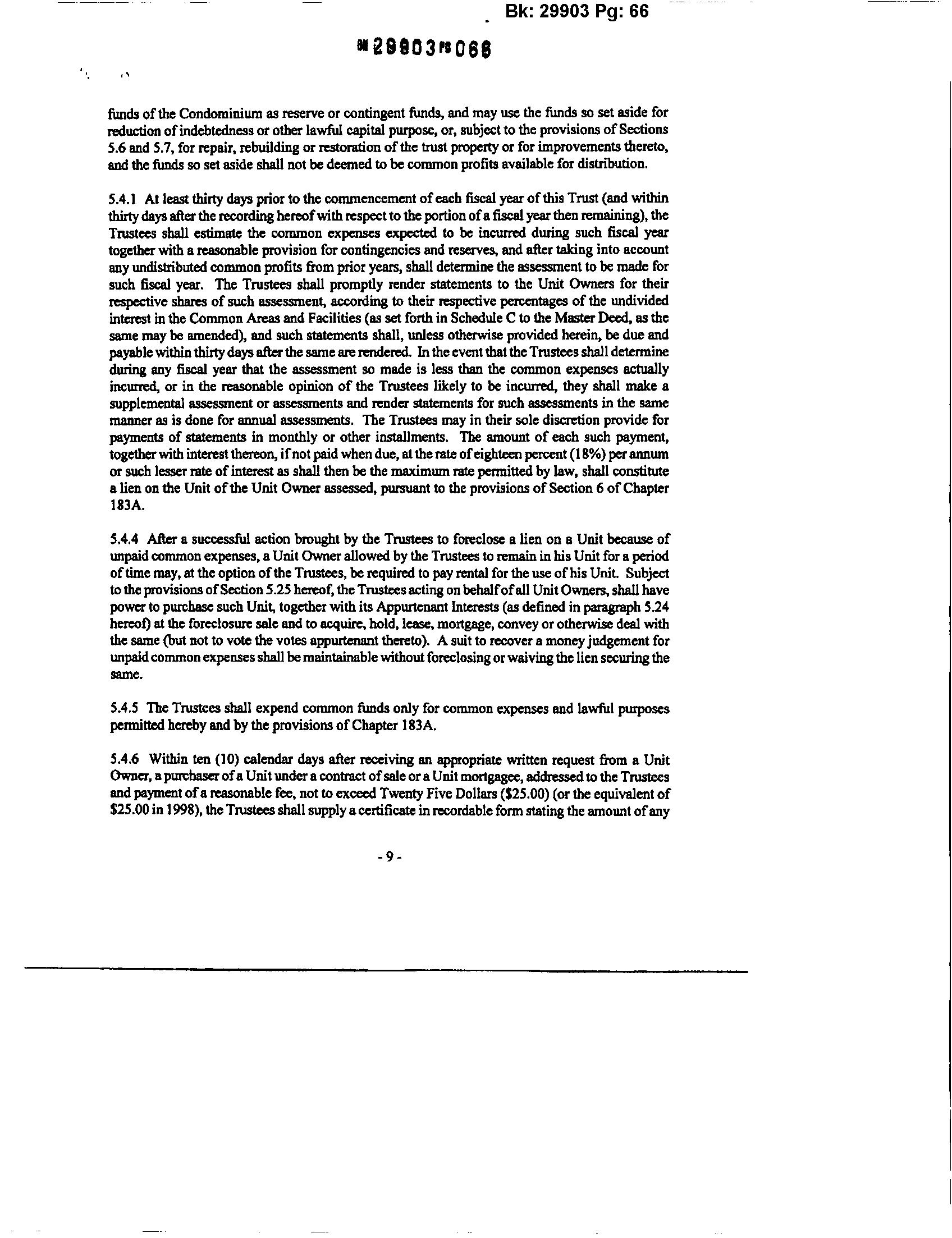 S.l7 InspectionofBooks. ReoorttoUnitOwners. Books,accountsandrecordsoftheTrusteesshall beopentoinspectionto anyofthe TrusteesandUnitOwnersand firstmortgageholdersoftheUnits at all reasonable times. The Trustees shall, as soon as reasonably possible after the close ofeach fiscalyear, ormore oftenifconvenienttothem, submittotheUnitOwnersareportoftheoperations ofthe Trustees for suchyear which shall includefmancial statements insuchsummaryform and in suchdetail astheTrustees shall deemproper. Anyperson whohasbeenfurnished with suchreport and shall have failed to object thereto by notice in writing to the Trustees given by certified or registered mail within a period ofninety days after the date ofthe receiptby him shall be deemed tohave assented thereto.