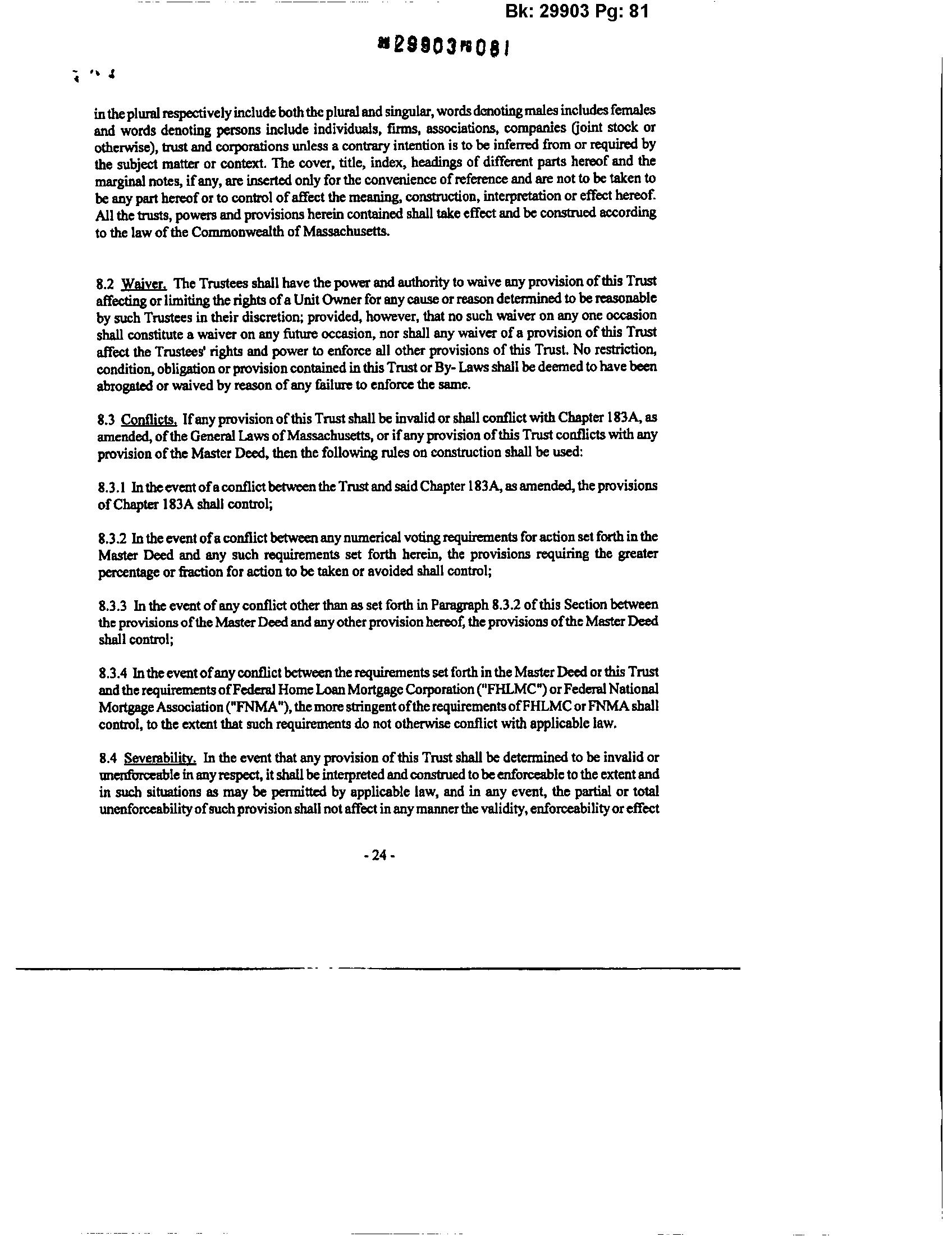 8.3.4 Intheeventofanyconflictbetweentherequirements setforth inthe MasterDeedorthis Trust andtherequirementsofFederalHomeLoanMortgageCorporation("FHLMC")orFederalNational MortgageAssociation("FNMA"),themorestringentoftherequirementsofFHLMCorFNMAshall control, to the extent that such requirements do not otherwise conflict with applicable law.