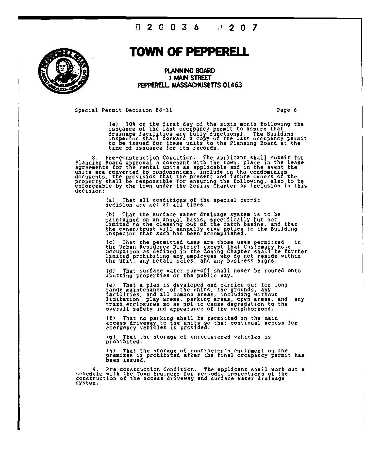 2. _ That the applicant's adherence to his plans aa in the revised submission, to the conditions imposed in this decision, as well as to other laws, rules, and regulations of Pepperell as they apply to this construction will provide that this project will not impair the of the district and adjoining districts, will not be detrimental to the environment, to the natural resources of the town, to the value of nearby property or to the health and welfare of the occupants and users of the or the citizens of the town. The board finds that this is the area designated in the Haster Plan for high density development, that there are other multifamily units within 300 feet of_the subject property. that the drainage system, tbe width ot _the driveway, the planned areas of open and the planned screening on the side and rear boundaries ct the property provide that this project will meet the needs_o! the town and the neighborhood, and the future owners of the units.