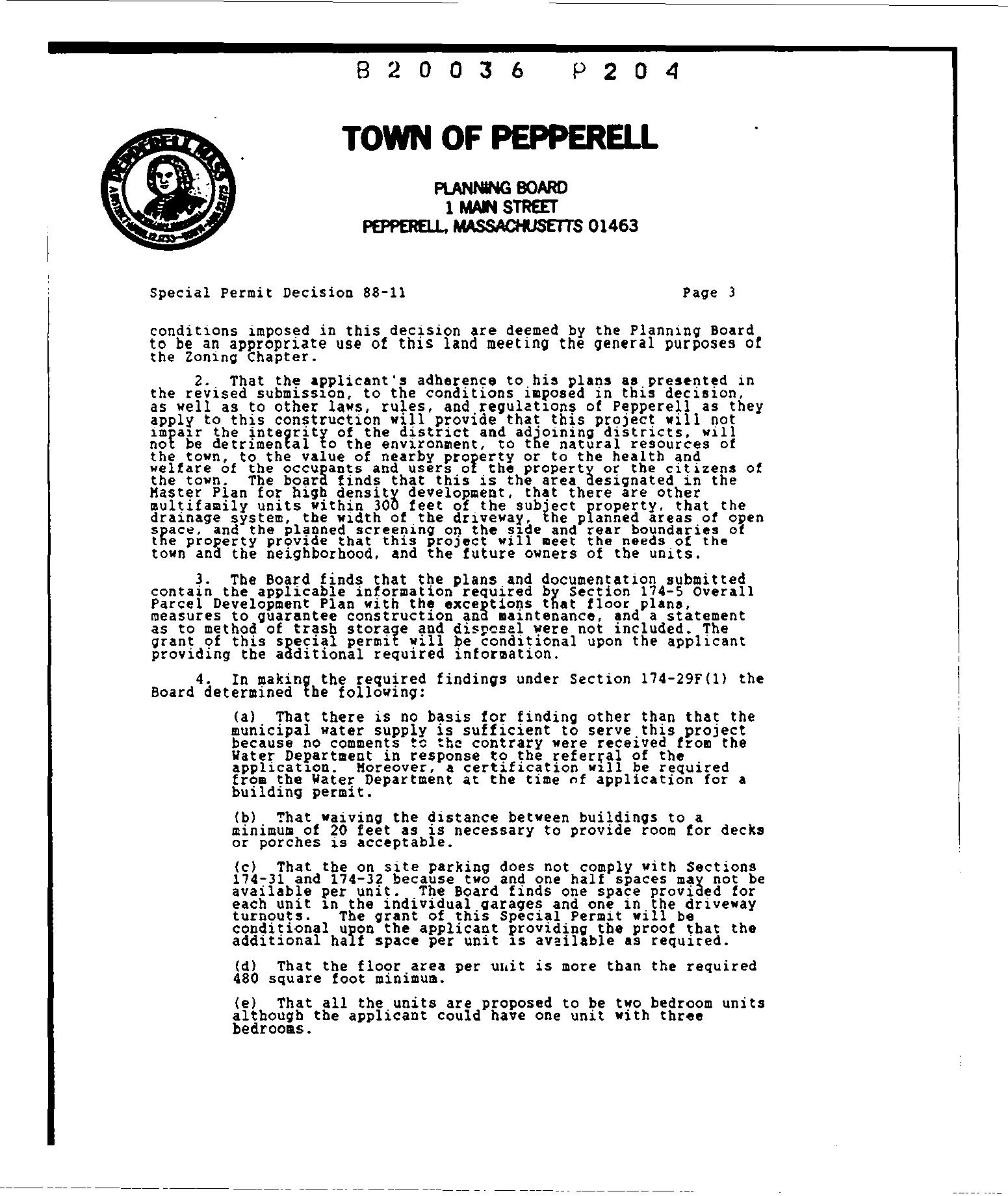 3. The Board finds that the plans and documentation submitted contain the applicable information required by Section 174-5 Overall Parcel Development Plan with the exceptions that floor plans, measures to guarantee construction and maintenance, and a statement as to method of trash storage and were not included. The Qrant of this special permit will be conditional upon the applicant providing the additional required information.