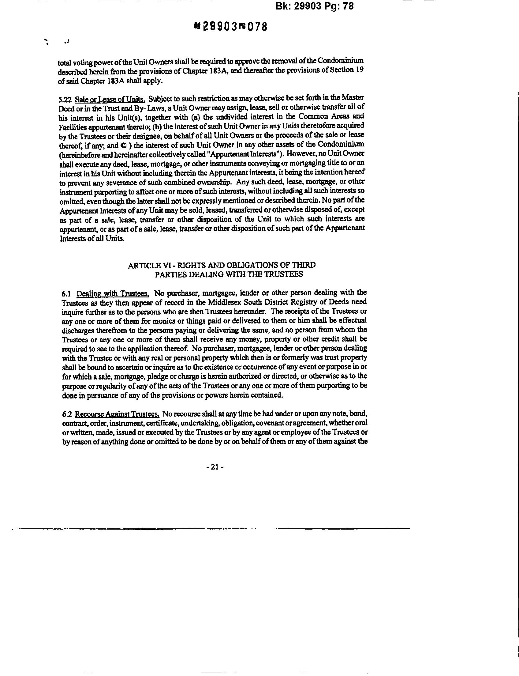 6.1 Dealing with Trustees. No purchaser, mortgagee, lender or other person dealing with the Trustees as they then appear of record in the Middlesex South District Registry ofDeeds need inquire further as to the persons who are then Trustees hereunder. The receipts ofthe Trustees or any one or more ofthem for monies or things paid or delivered to them or him shall be effectual discharges therefrom to the personspaying or delivering the same, and no pen;on from whom the Trustees or any one or more ofthem shaJI receive any money, property or other credit shall be required toseetothe applicstionthereof. No purchaser,mortgagee, lender orotherpen;on dealing with the Trustee orwith anyreal orpersonal propertywhich then is or formerly was trustproperty shall beboundto ascertain orinquireas to the existenceoroccurrenceofanyeventorpurposeinor for which asale, mortgage, pledge orchargeishereinauthorized ordirected, orotherwise asto the purpose orregularity ofanyofthe acts oftheTrustees orany one ormore ofthempurporting to be done in pursuance ofany ofthe provisions or powers herein contained.