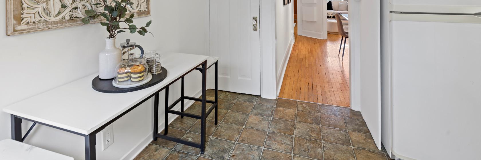 To usher in a modernized ambiance, the design team focused on key areas such as the kitchen and living room. Upgrading the kitchen involved a complete overhaul, from cabinetry to countertops, and even the flooring, which was transformed with a lighter wood hue in a stylish herringbone pattern. Addressing the outdated plumbing was paramount, ensuring that the infrastructure met current industry standards. However, challenges arose, particularly in integrating pot lights into the living room. The constraints of a concrete-built condo necessitated creative solutions, including a subtle drop in the ceiling drywall to accommodate the lighting fixtures. Despite these hurdles, the result preserved the spaciousness of the room while enhancing its illumination, a testament to the ingenuity of the design team.