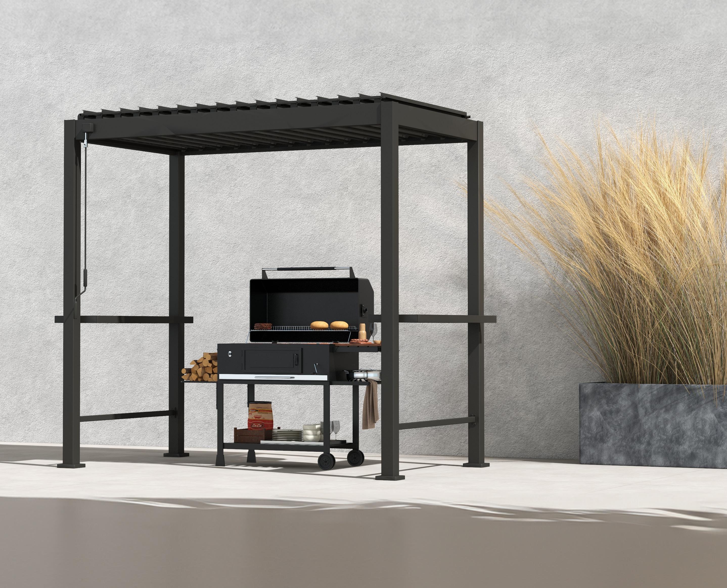 Mirador BBQ on kaasaegne ja funktsionaalne varikatus/aiapaviljon, mis sobib ideaalselt väikese väliköögi sisseseadmiseks. Mõlemal küljel paiknevad riiulid, mis pakuvad tööpindadena lisamugavust.