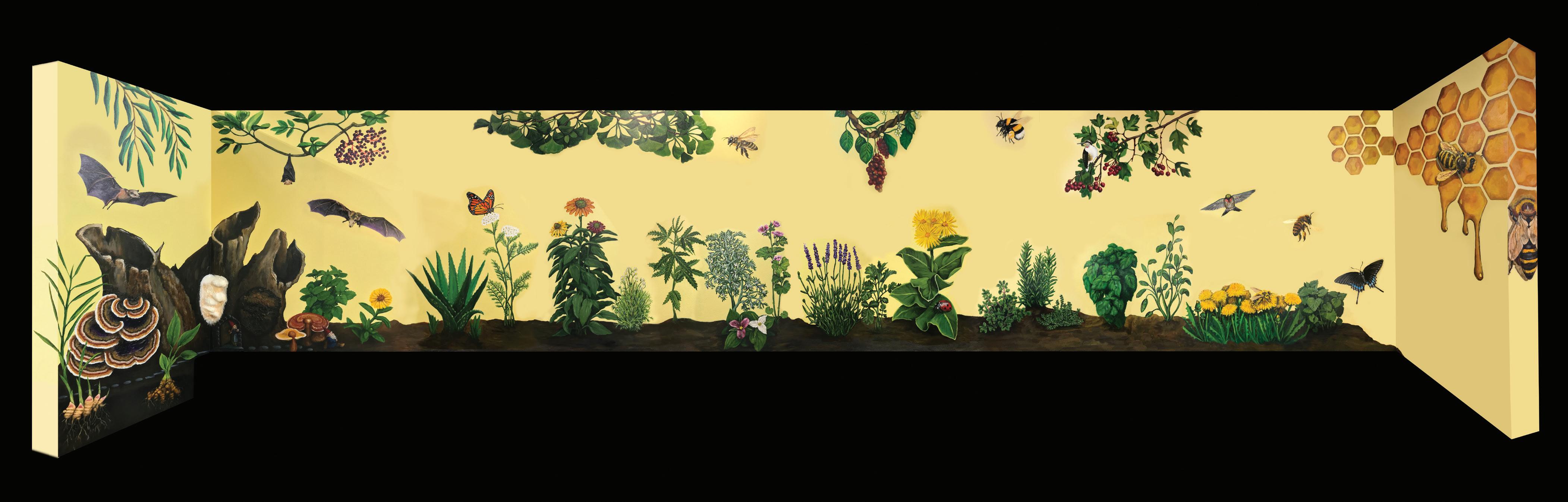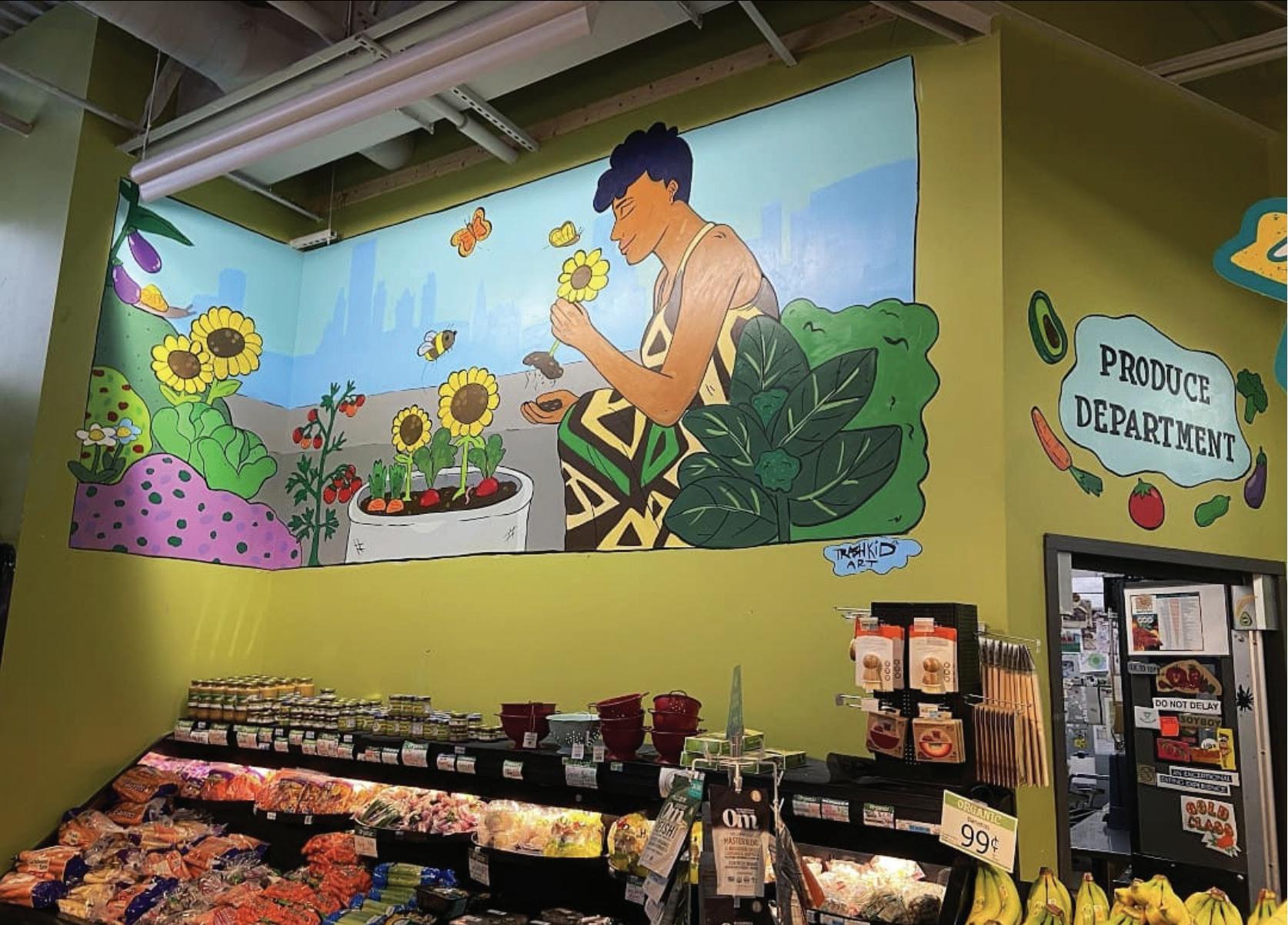 Where to begin? A longtime co-op member-owner, wellness department staffer, resident artist & creative, I.T. helper, face painter, local art legend, teacher, and friend to all. Nina's been wanting to get her hands on this wall for years, and oh my, did she deliver. A magical secret garden & pollinator haven,