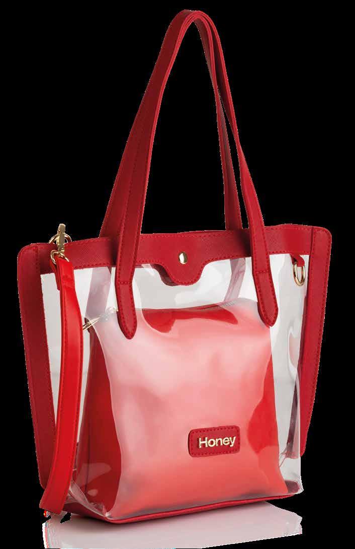 Clear PVC Outer handbag. Red PU trim. Gold plated hardware. Magnetic clip closure. Detachable shoulder strap. Red PU inner bag, includes metal zip closure. Fully lined inner bag, includes inner side pocket. Protective dust cover.