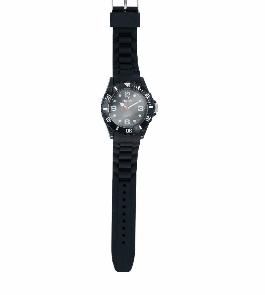 Black silicone bracelet style watch. Black decorative bezel. Black silicone strap. Black dial.