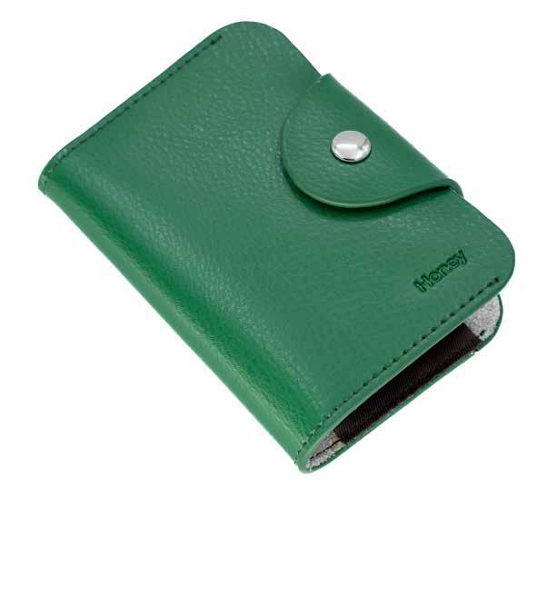 Genuine leather card holder. Clip closure. Holds 13 individual cards as well as two compartments for 10 business cards each side.