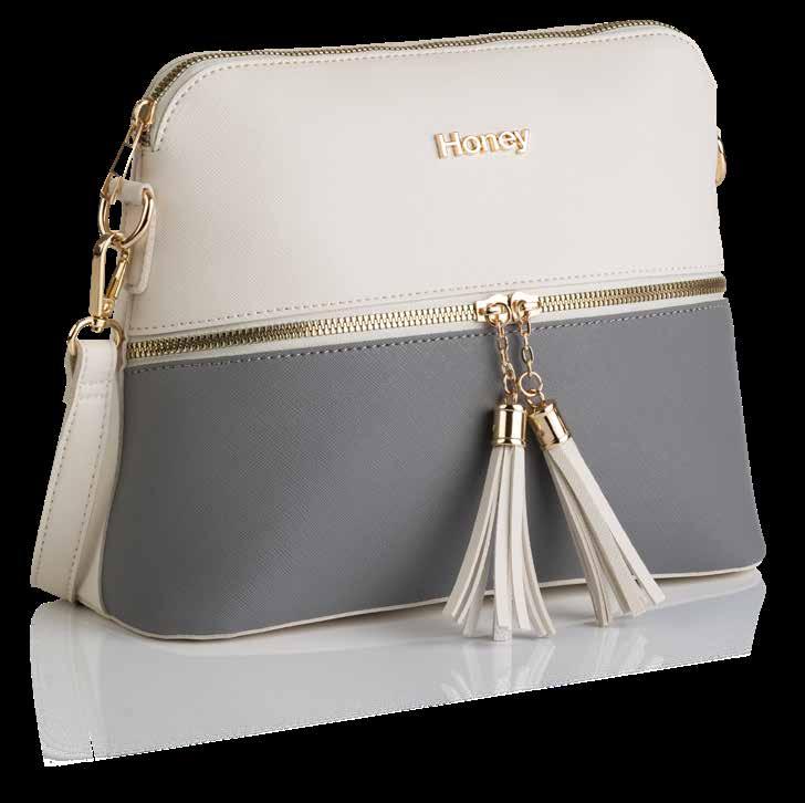 Off white PU handbag. Grey PU detail. Gold plated hardware. Metal zip closure. Front pocket, includes metal zip closure. Fully lined. Inner side pockets. Matching shoulder strap. Protective dust cover.