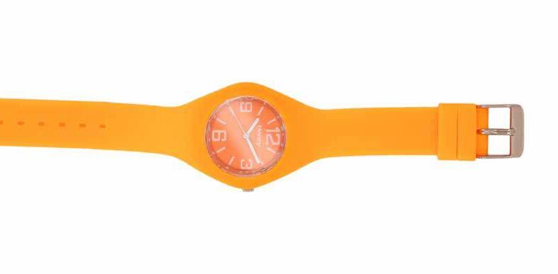 Neon orange silicone bracelet style watch. Orange decorative bezel. Neon orange silicone strap. Orange dial.