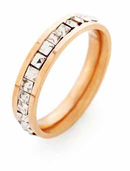 Rose gold plated stainless steel ring. Clear glass crystal. Width: 10mm.