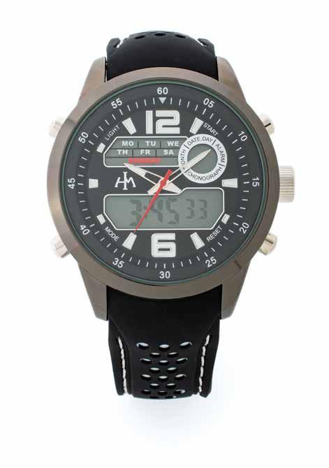 Black silicon bracelet style watch. Gold plated strap detail. Jet black dial. Gold plated hands. Gold plated case.