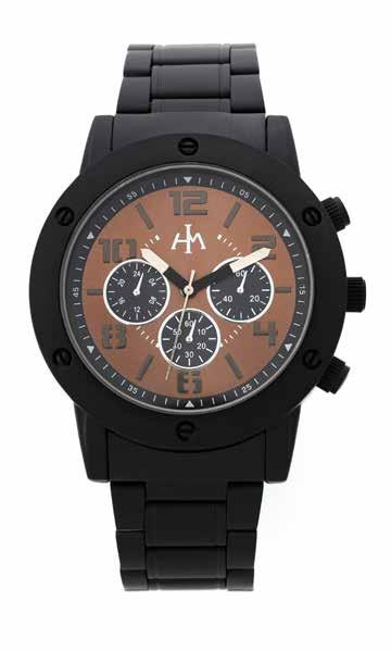 Matt black coated bangle style analogue watch. Brown sunray dial with decorative sub-dials. Jet and silver plated hands. Push clasp closure.