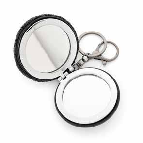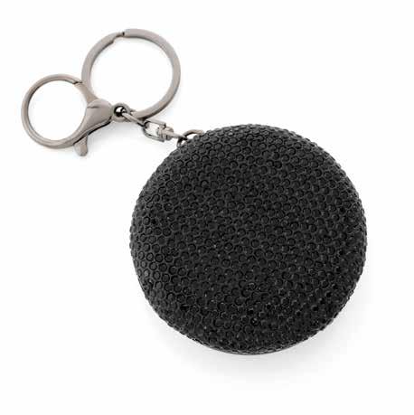 Rhodium plated keyring. Black PU trim. 60mm drop.