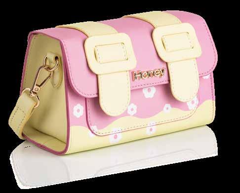 Yellow textured PU crossbody mini bag. Candy pink and white print detail. Flap with magnetic clip closures. Front pouch. Lined. Protective dust cover. Shoulder strap: 123cm extends to 133cm.
