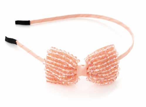 Light pink satin covered alice band. Gross-grain bow with light rose AB bead detail. 5mm width. 12cm diameter