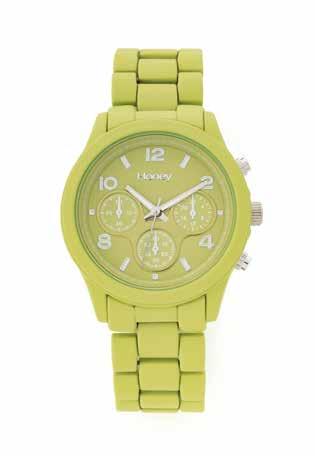 Matt army green coated bangle style analogue watch. Matching sunray dial with decorative sub-dials. Army green and silver plated hands. Push clasp closure. Closes 21cm. 45mm case.